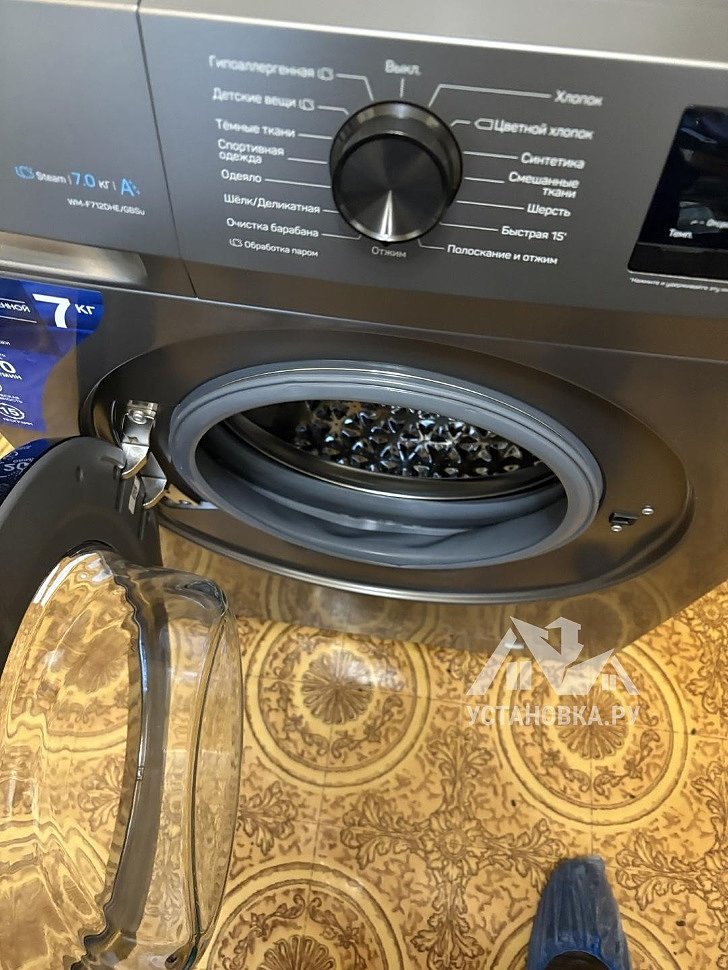 - Снятие транспортировочных креплений у стиральной машины, выравнивание по уровню.