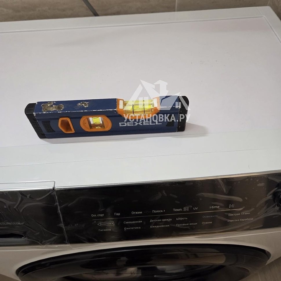 - Снятие транспортировочных креплений у стиральной машины, выравнивание по уровню.