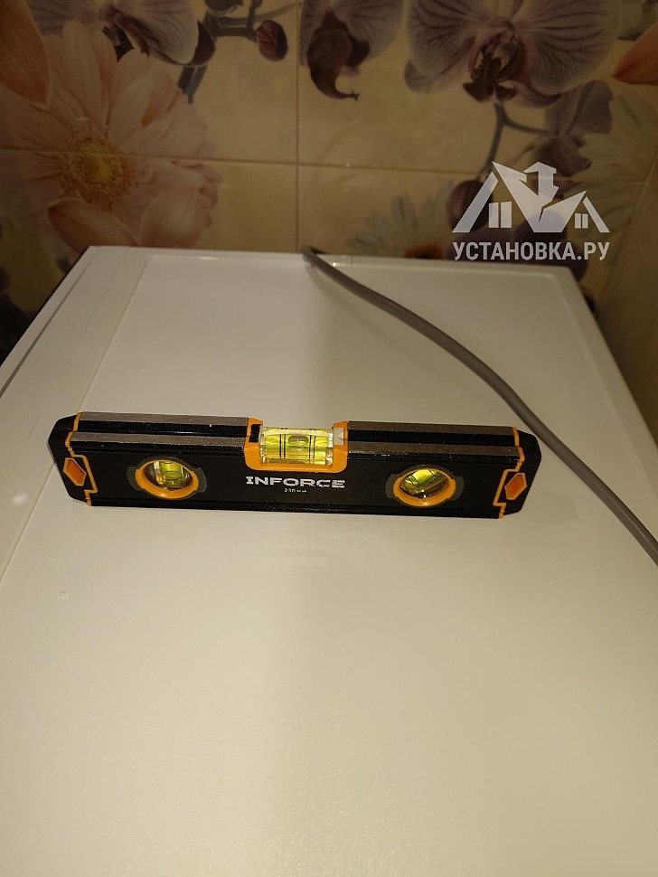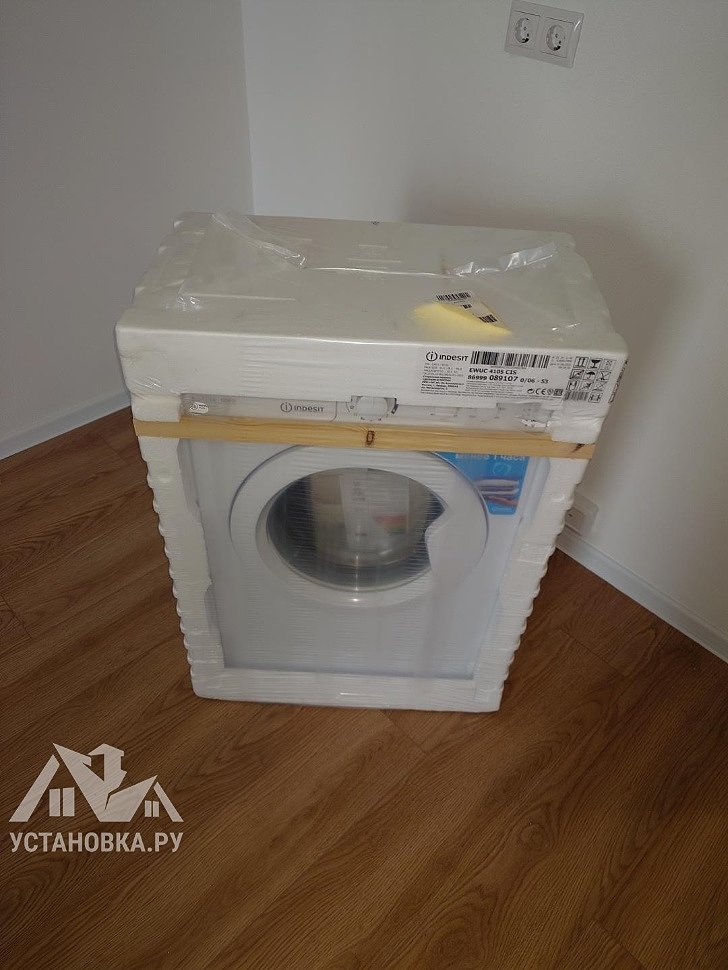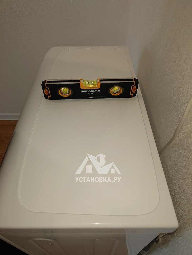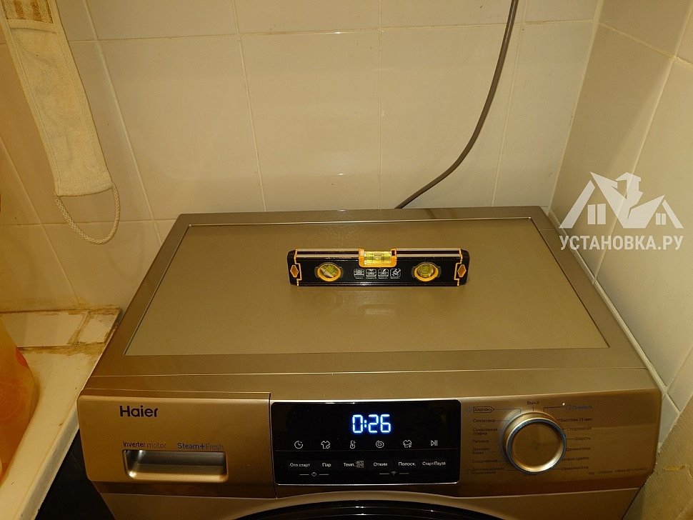 - Снятие транспортировочных креплений у стиральной машины, выравнивание по уровню.