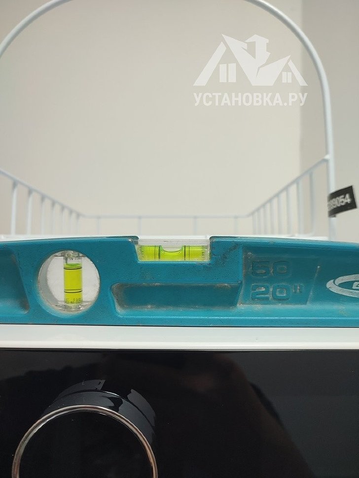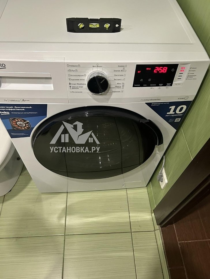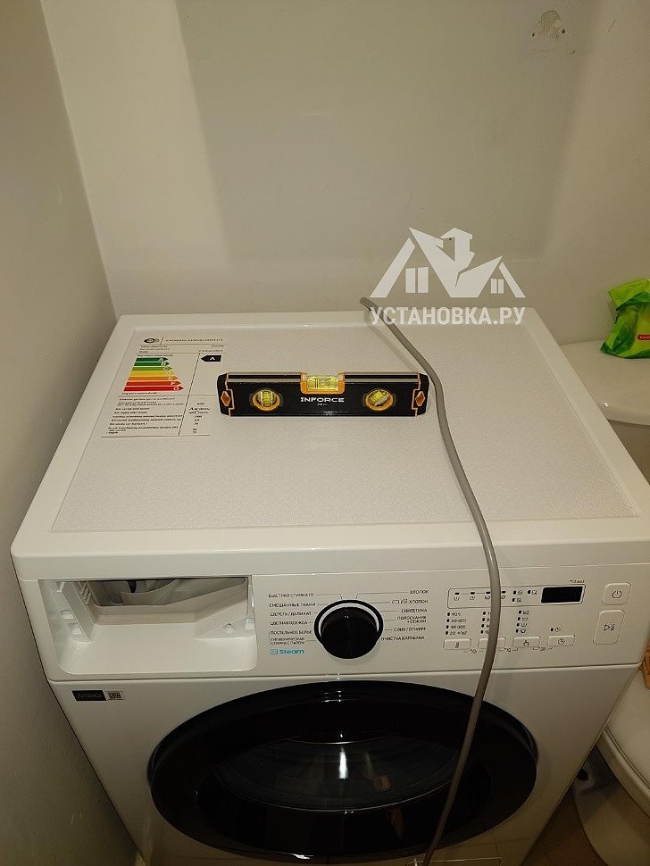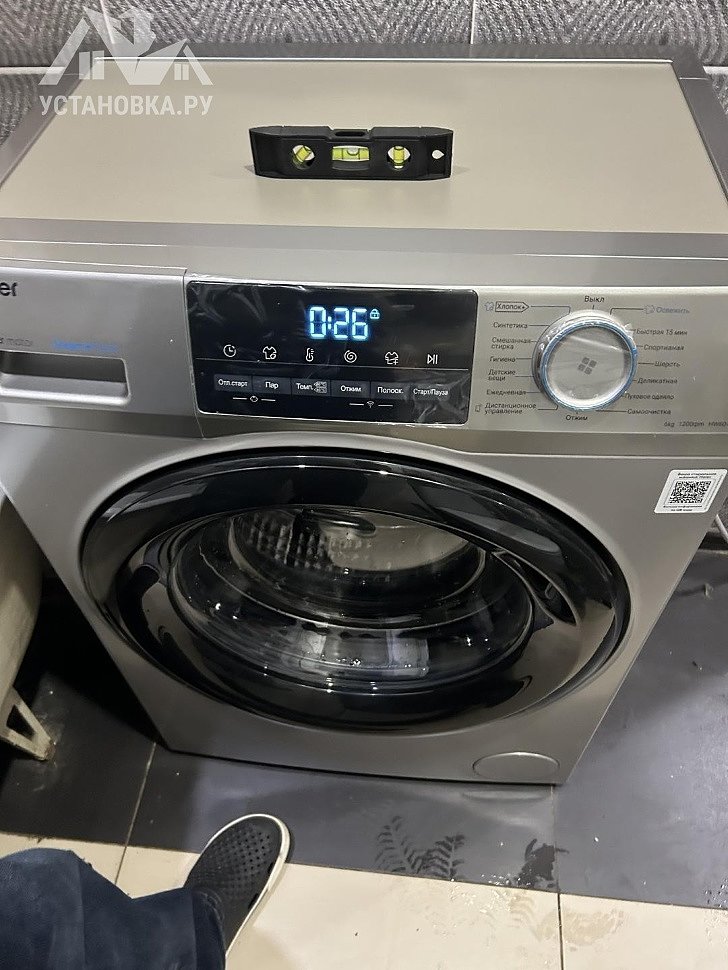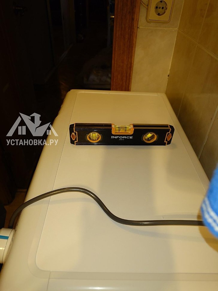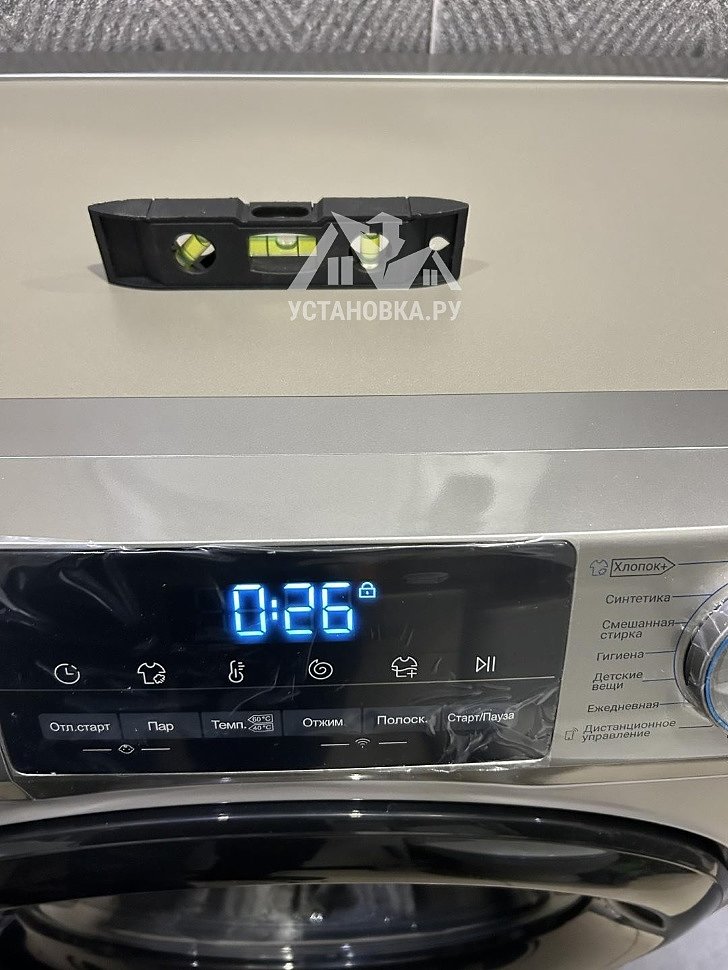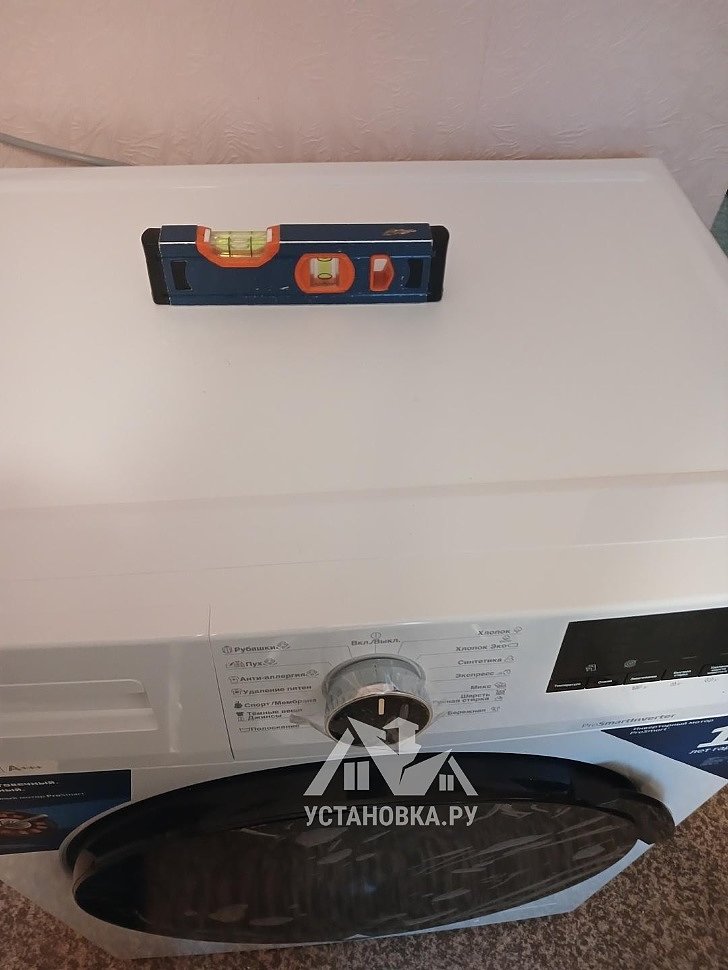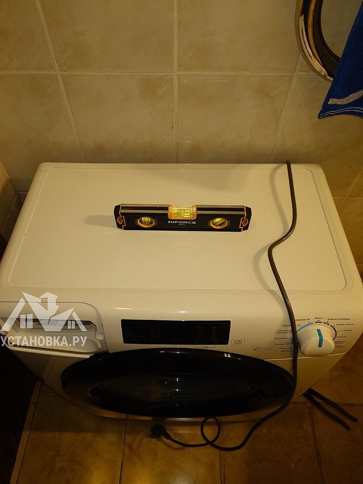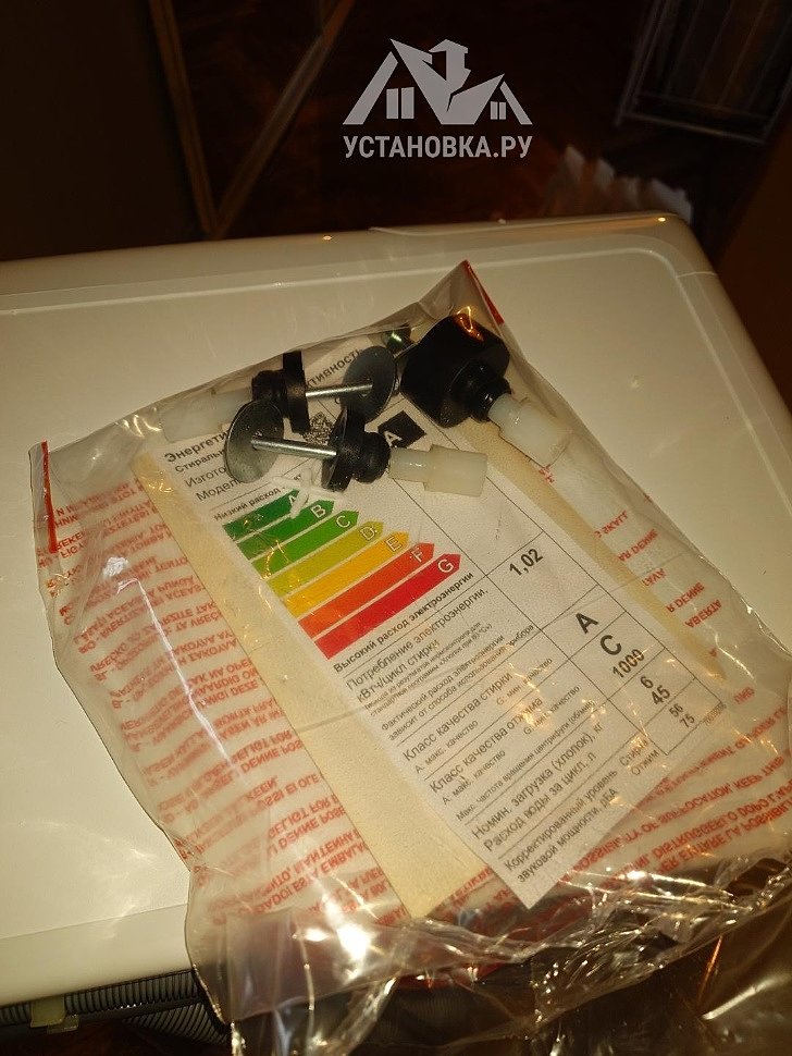 - Снятие транспортировочных креплений у стиральной машины, выравнивание по уровню.
