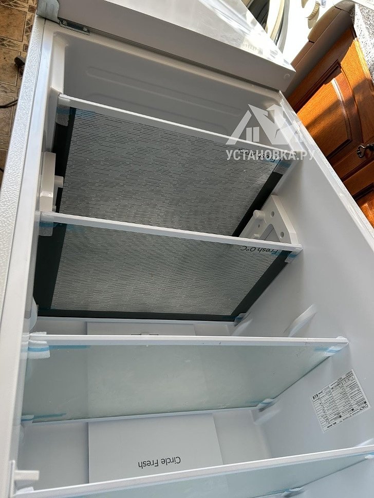 - Демонтаж либо установка нижней полки под холодильник. Для выставления холодильника по высоте.