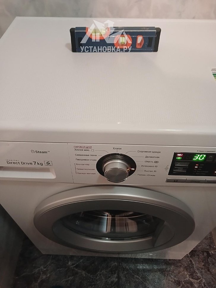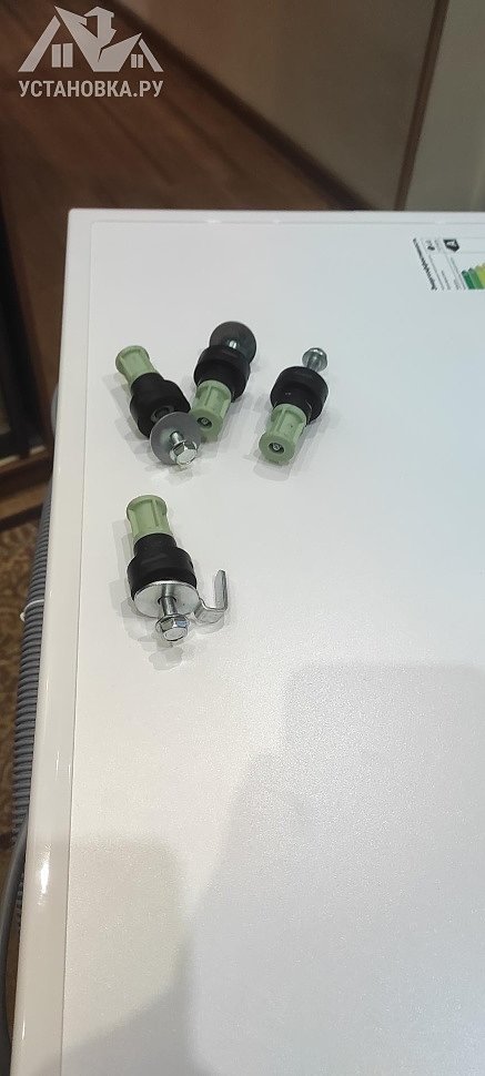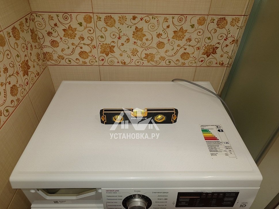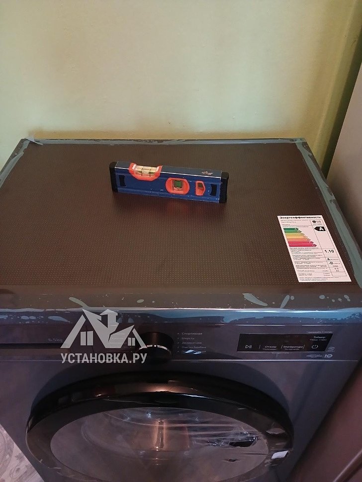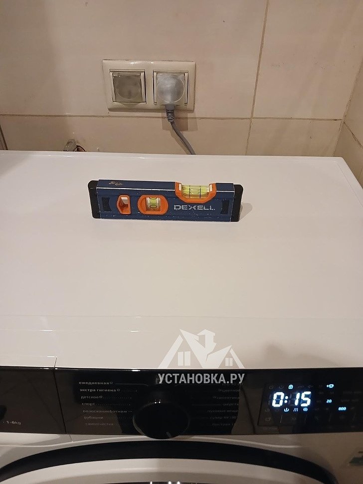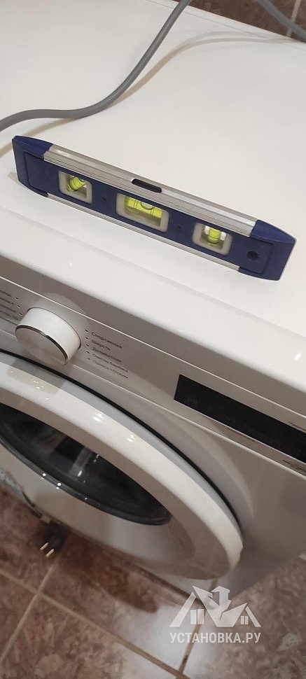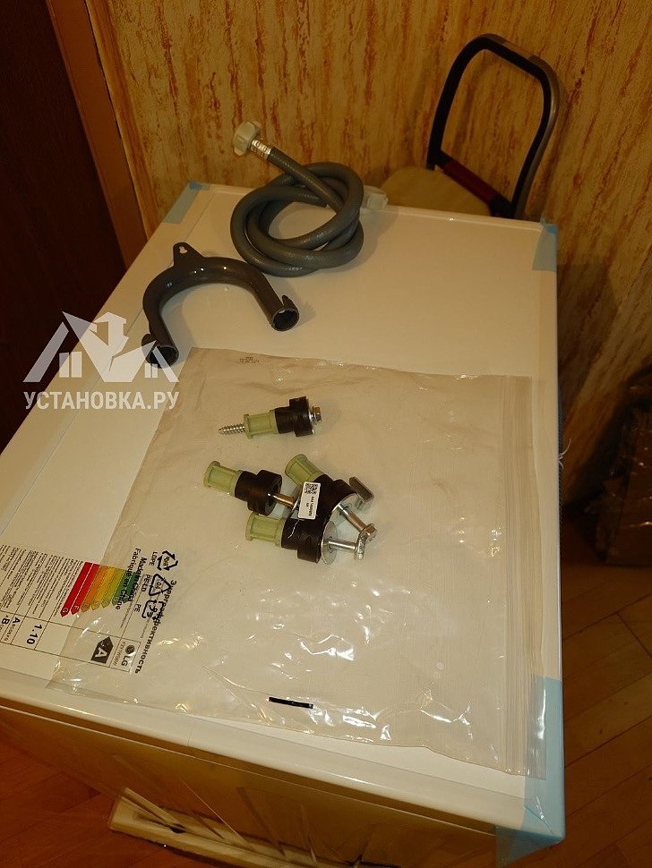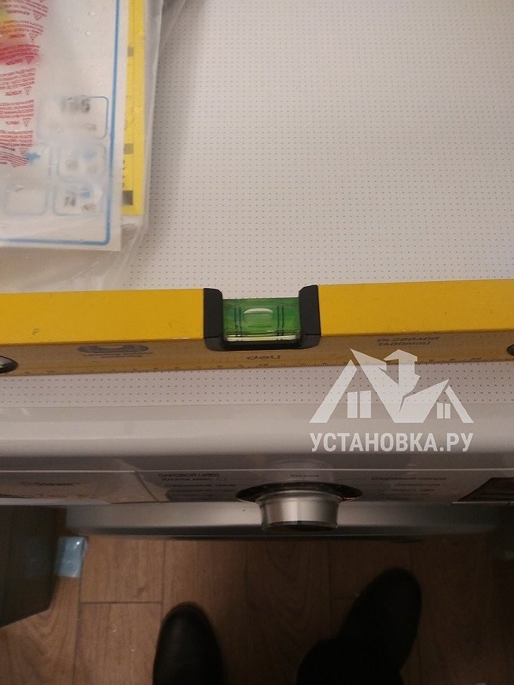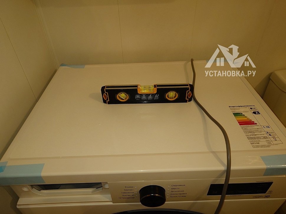 - Снятие транспортировочных креплений у стиральной машины, выравнивание по уровню.