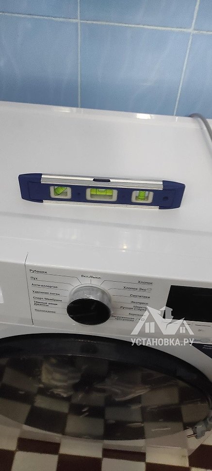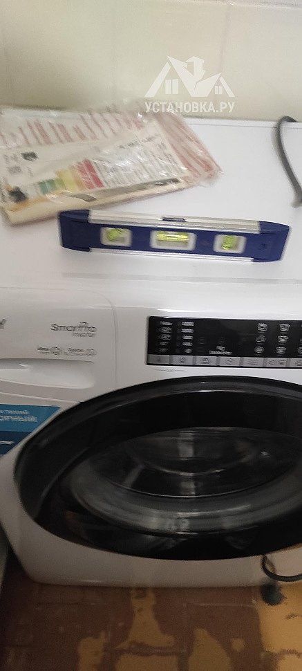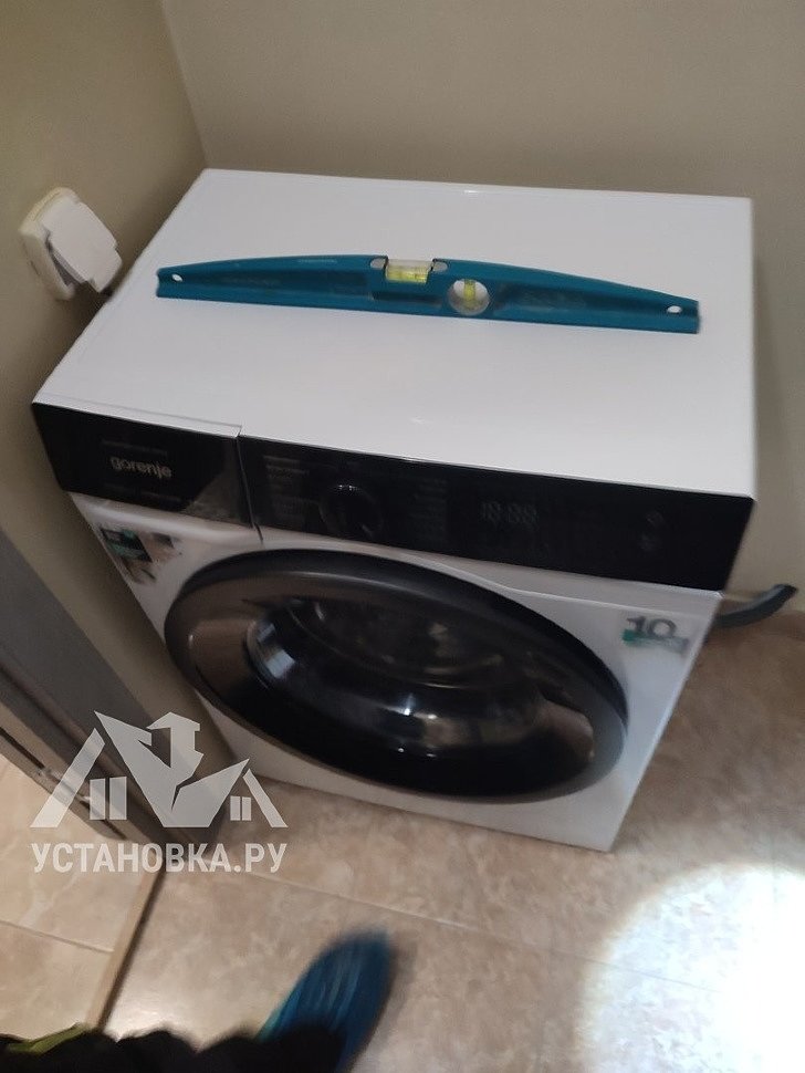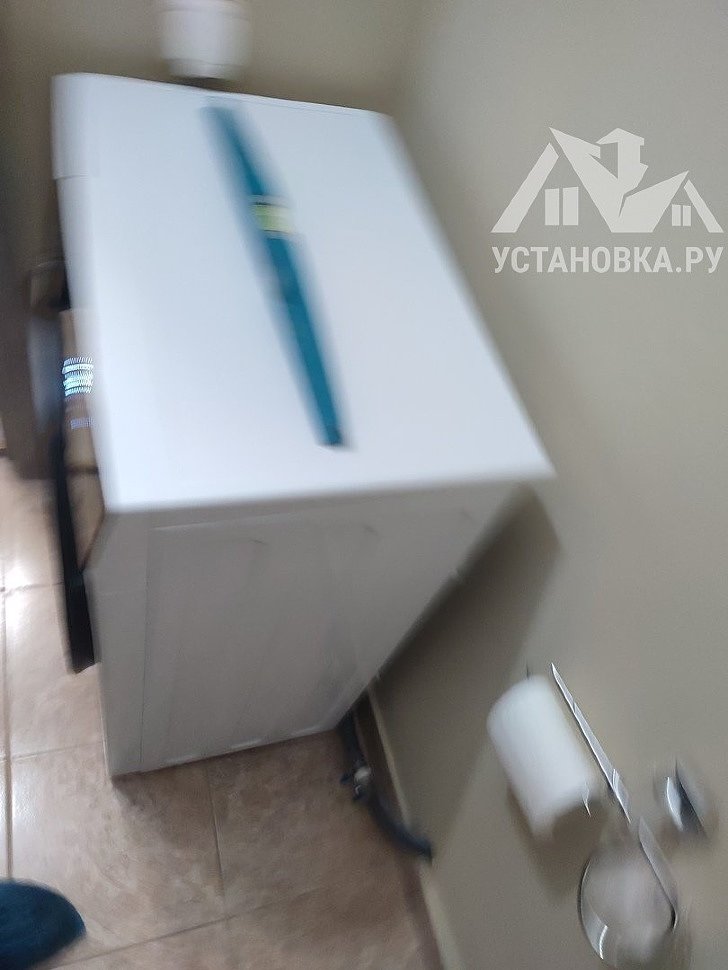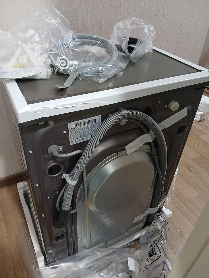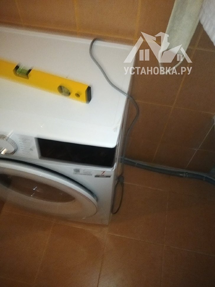 - Снятие транспортировочных креплений у стиральной машины, выравнивание по уровню.