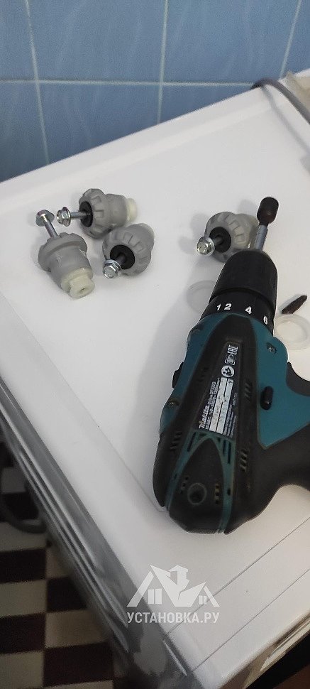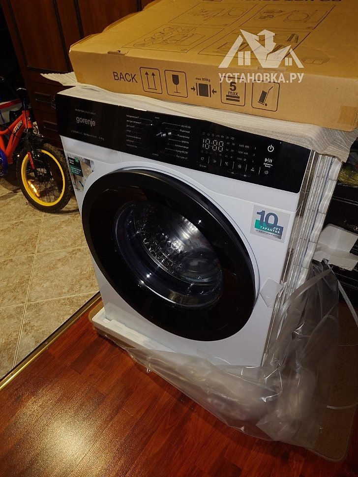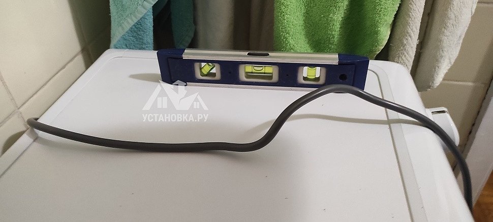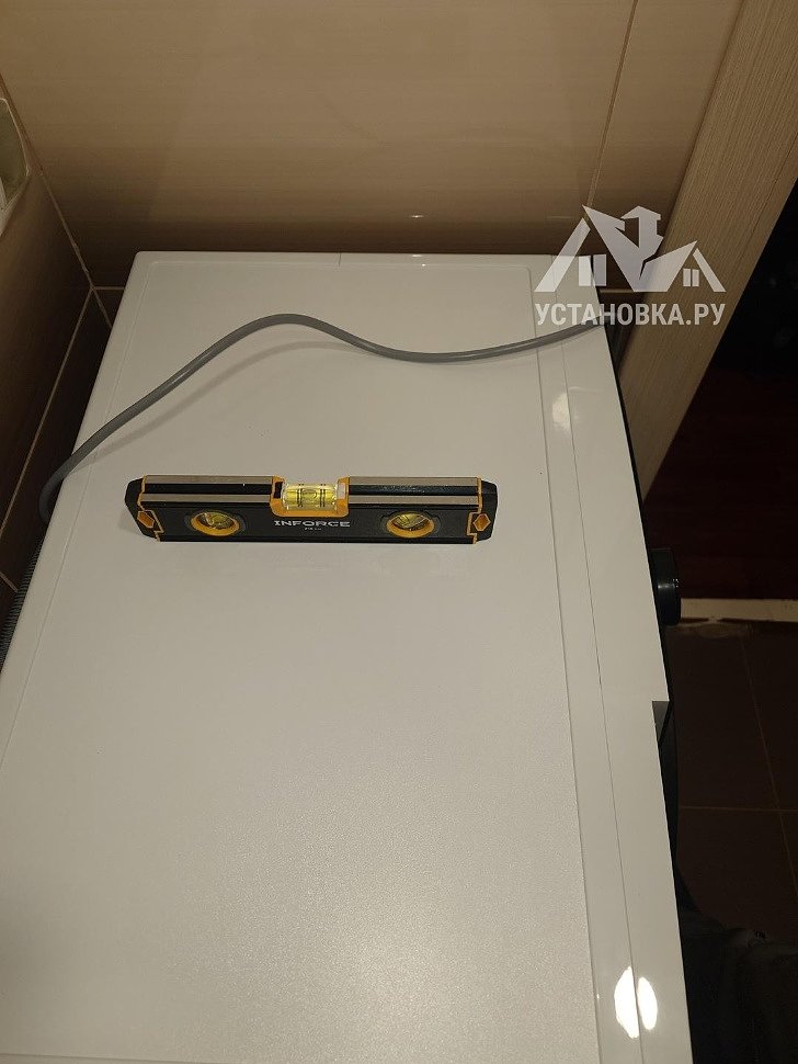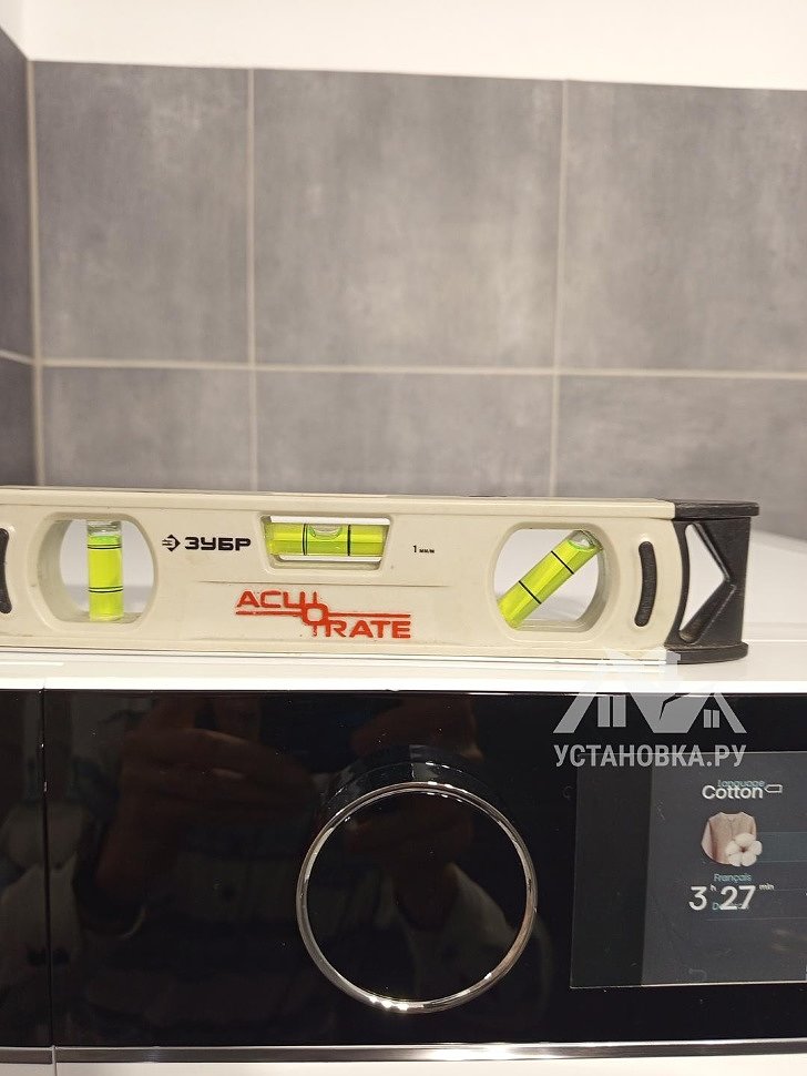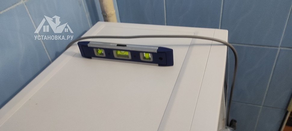 - Снятие транспортировочных креплений у стиральной машины, выравнивание по уровню.