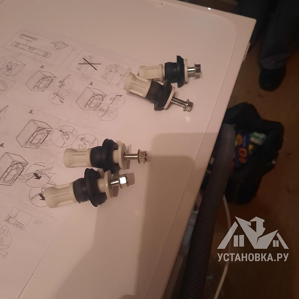 - Снятие транспортировочных креплений у стиральной машины, выравнивание по уровню.