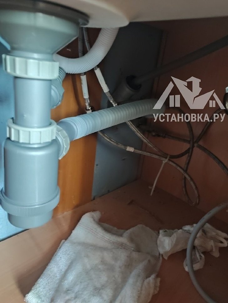 - Монтаж нового сифона и гофры с подключеним к канализации.