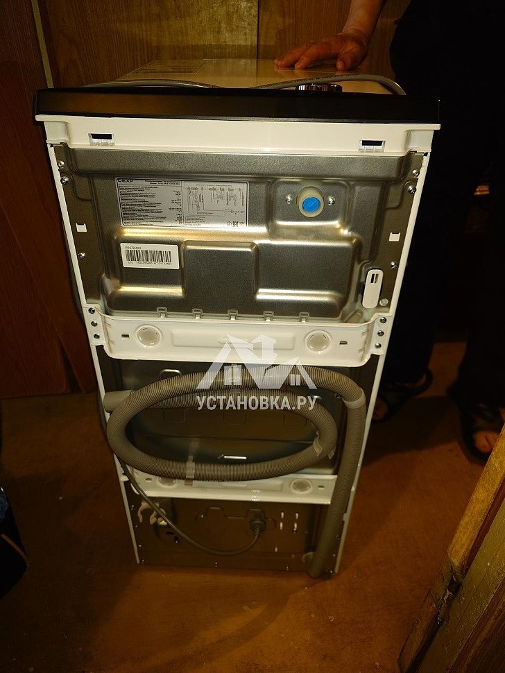 - Снятие транспортировочных креплений у стиральной машины, выравнивание по уровню.