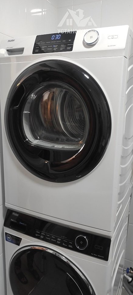 Примечание: Сушильная машина по размерам выглядит как стиралка, её ставят на стиральную машину сверху, из коммуникаций для неё нужна розетка и слив как у стиральной машины, если не делать слив, то в сушильной машине предусмотрен лоток, который позволяет выливать воду без организации слива.