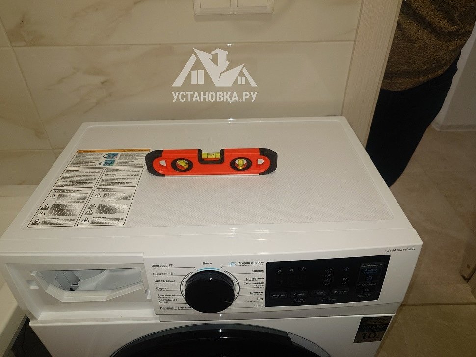 - Снятие транспортировочных креплений у стиральной машины, выравнивание по уровню.