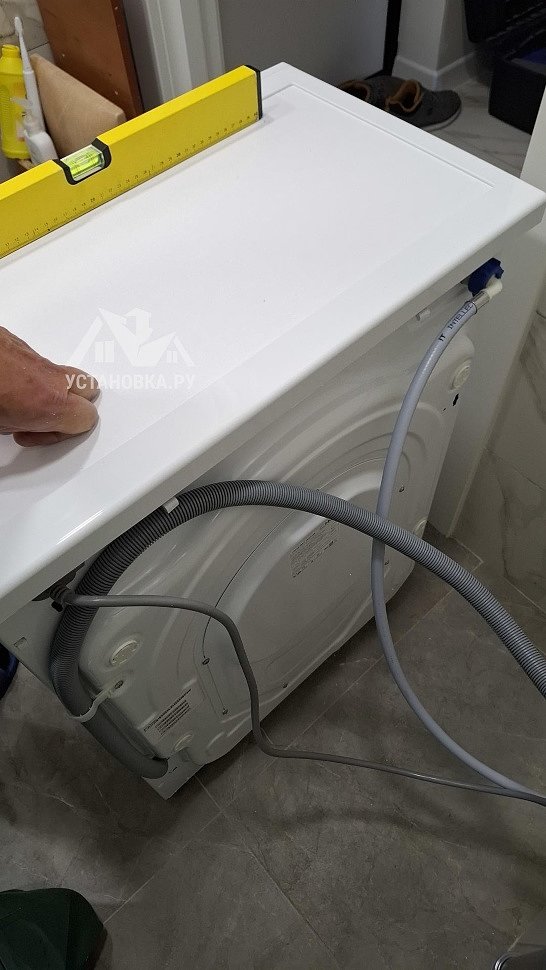 - Снятие транспортировочных креплений у стиральной машины, выравнивание по уровню.