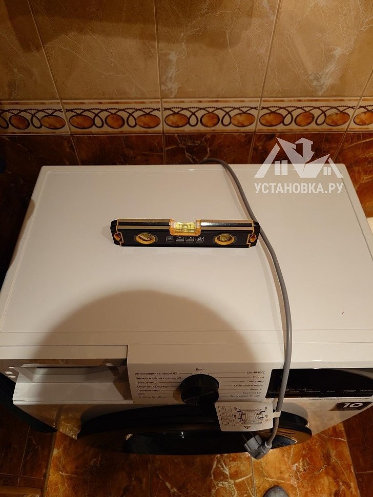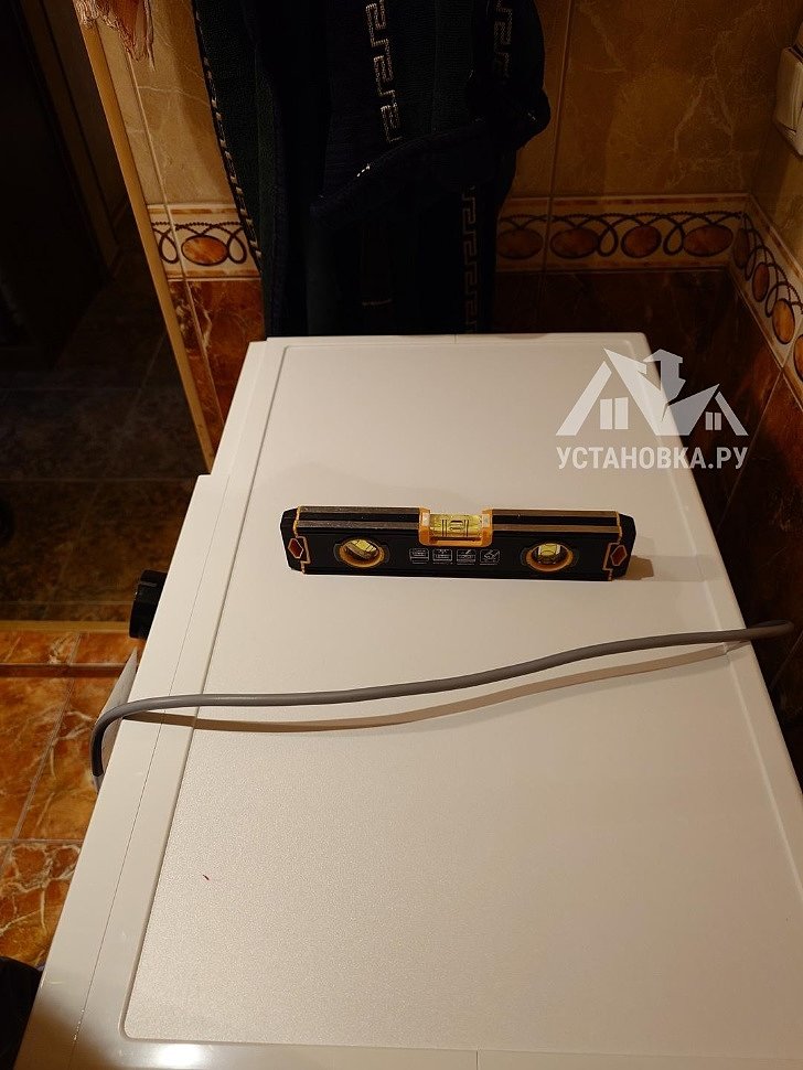 - Снятие транспортировочных креплений у стиральной машины, выравнивание по уровню.