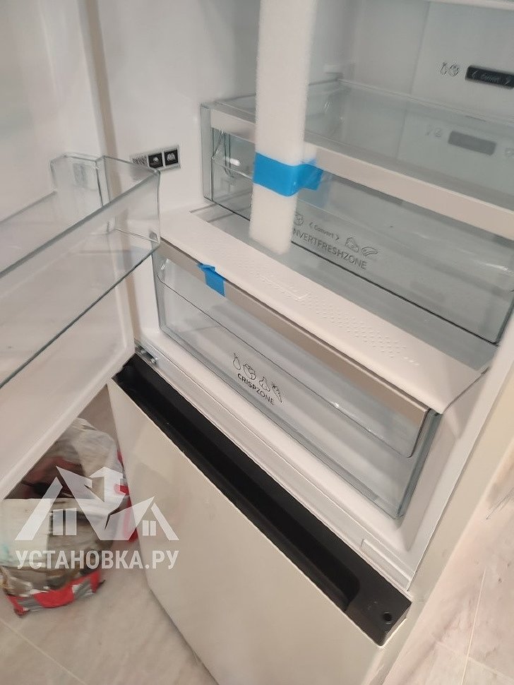 - Демонтаж либо установка нижней полки под холодильник. Для выставления холодильника по высоте.