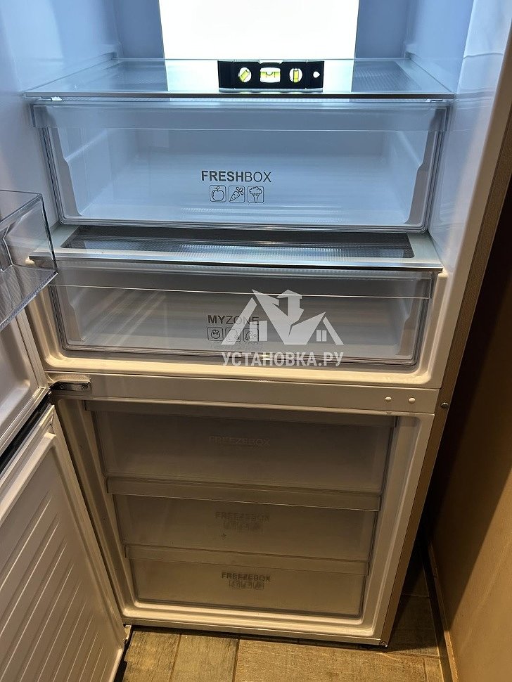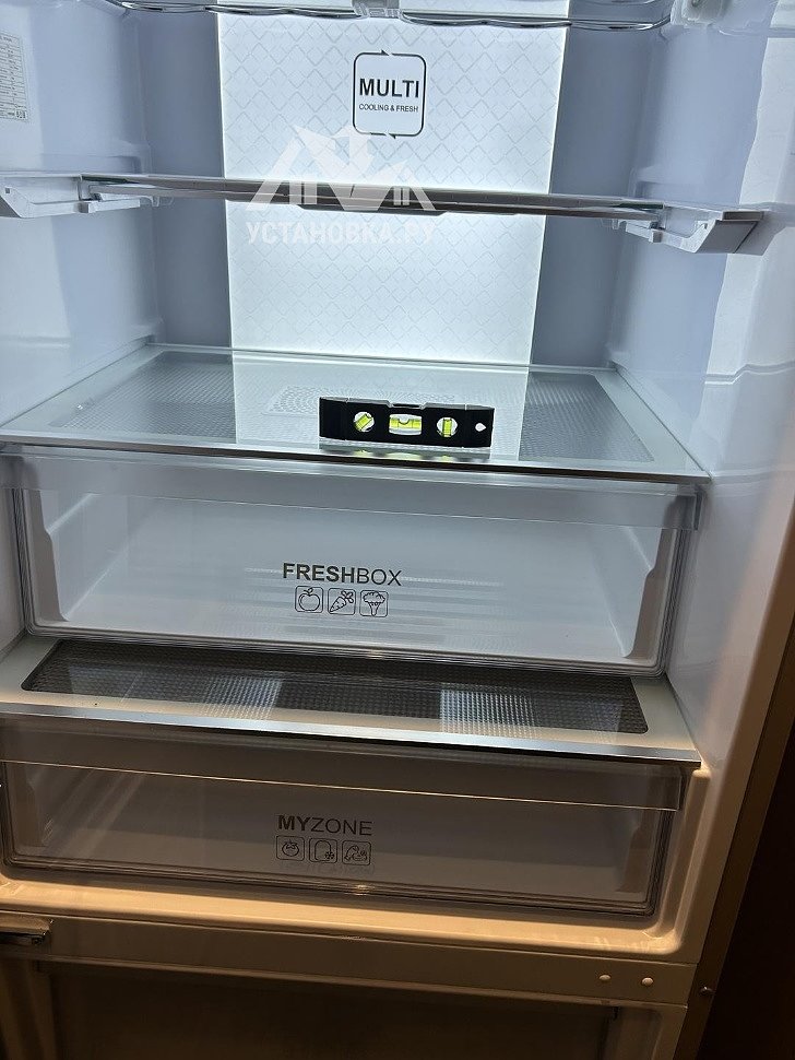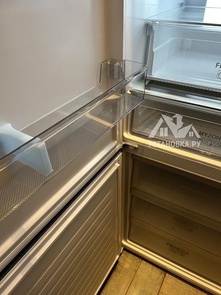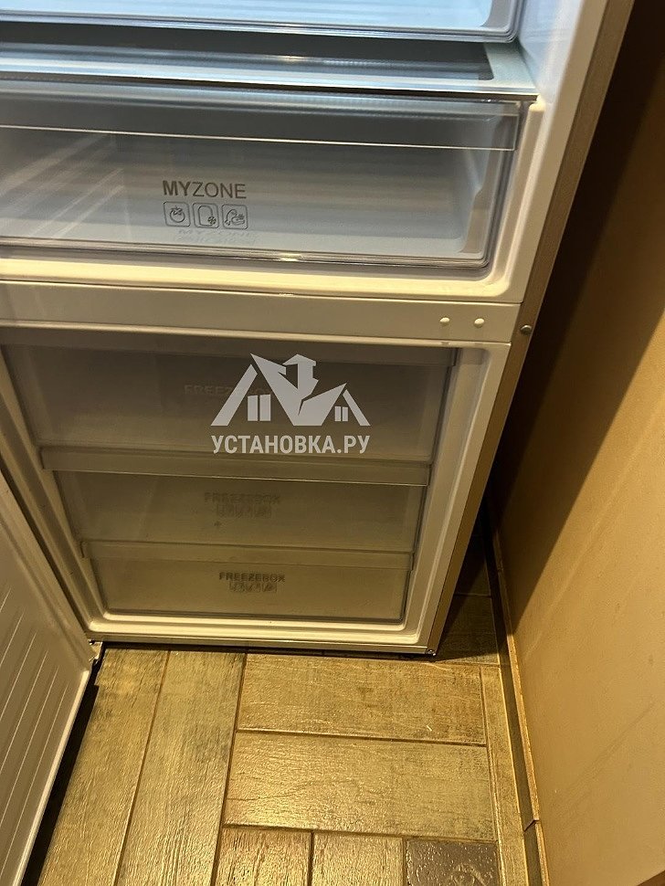 - Демонтаж либо установка нижней полки под холодильник. Для выставления холодильника по высоте.
