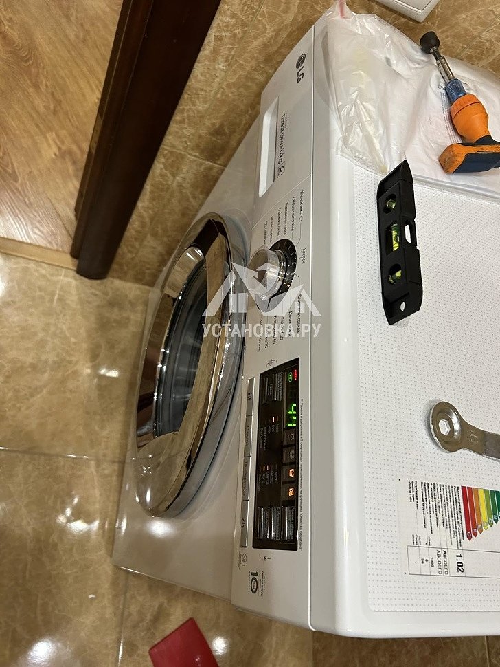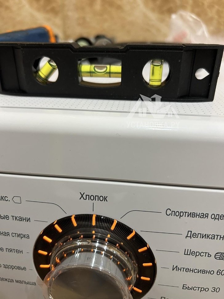 - Снятие транспортировочных креплений у стиральной машины, выравнивание по уровню.