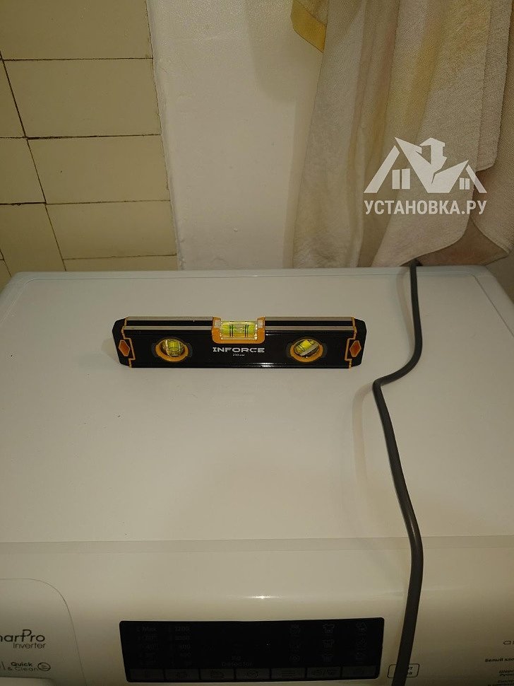 - Снятие транспортировочных креплений у стиральной машины, выравнивание по уровню.