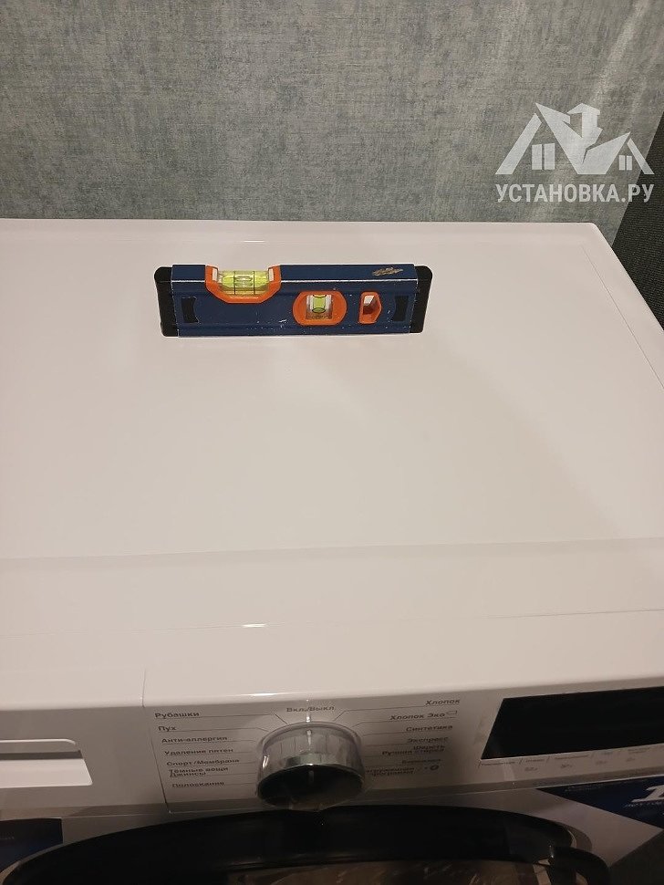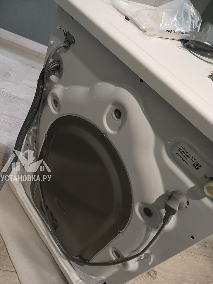 - Снятие транспортировочных креплений у стиральной машины, выравнивание по уровню.