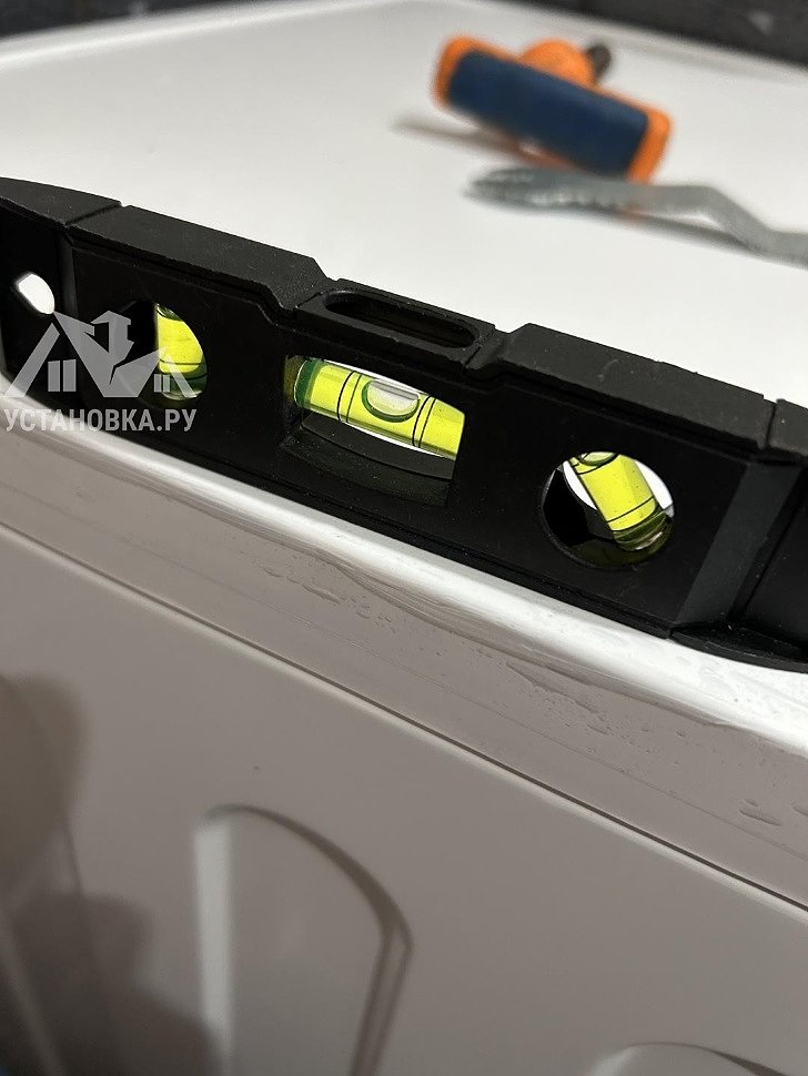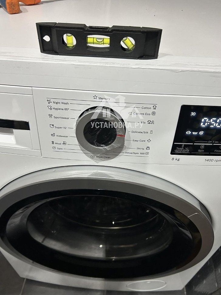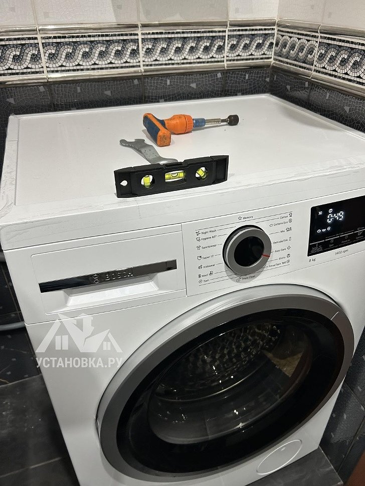 - Снятие транспортировочных креплений у стиральной машины, выравнивание по уровню.