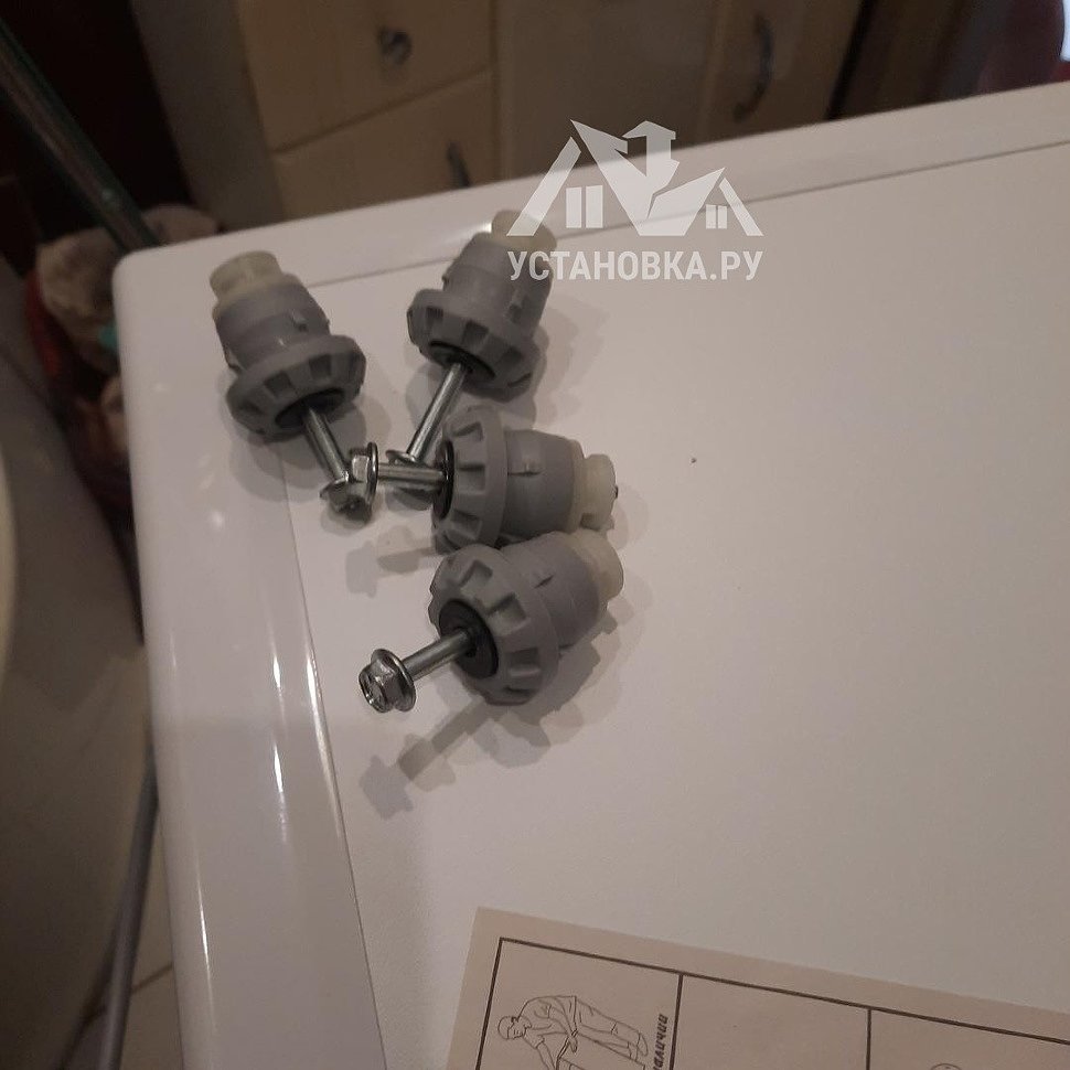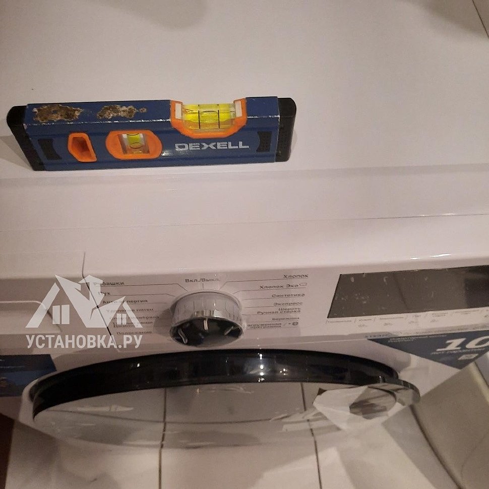 - Снятие транспортировочных креплений у стиральной машины, выравнивание по уровню.