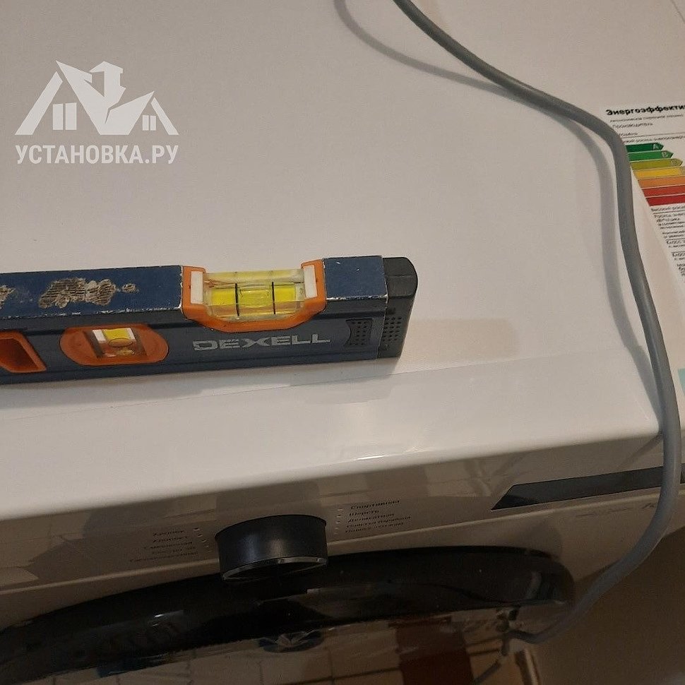 - Снятие транспортировочных креплений у стиральной машины, выравнивание по уровню.