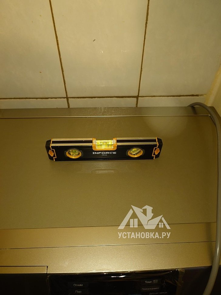 - Снятие транспортировочных креплений у стиральной машины, выравнивание по уровню.