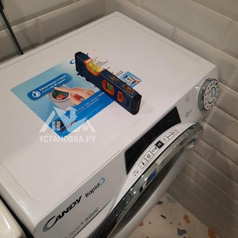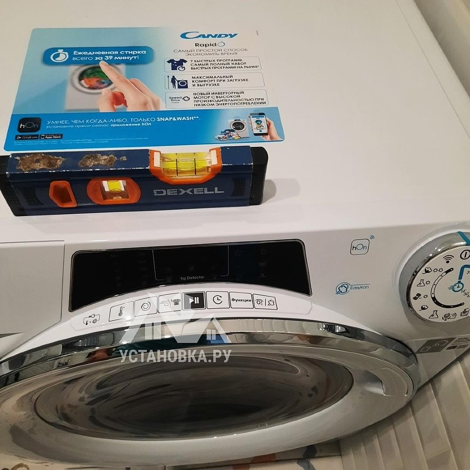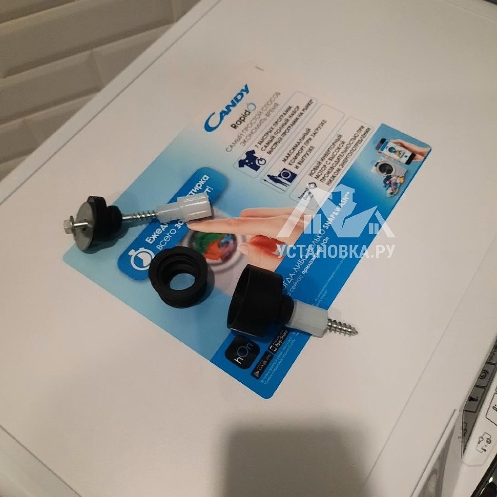 - Снятие транспортировочных креплений у стиральной машины, выравнивание по уровню.