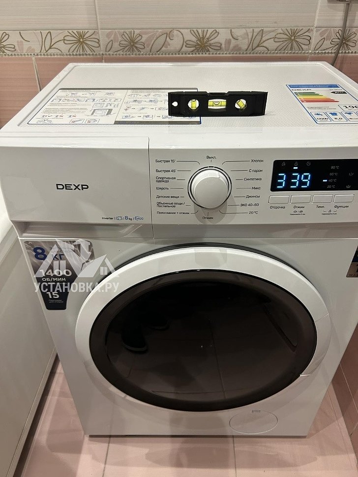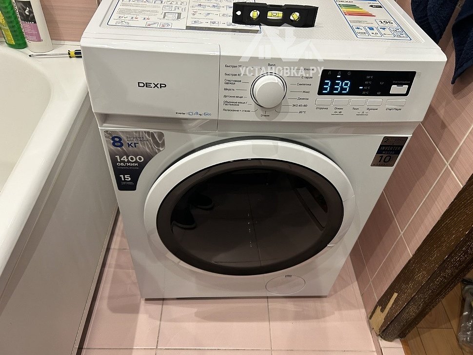 - Снятие транспортировочных креплений у стиральной машины, выравнивание по уровню.