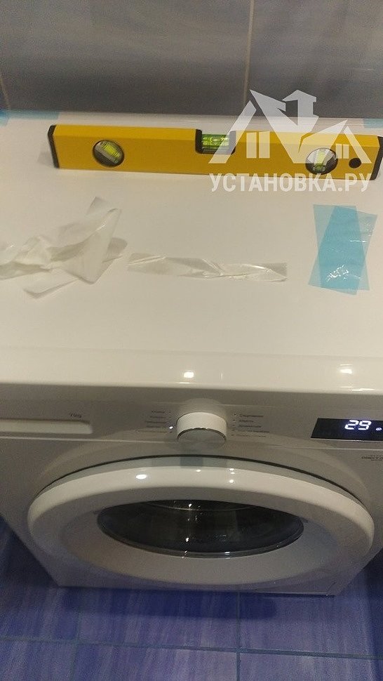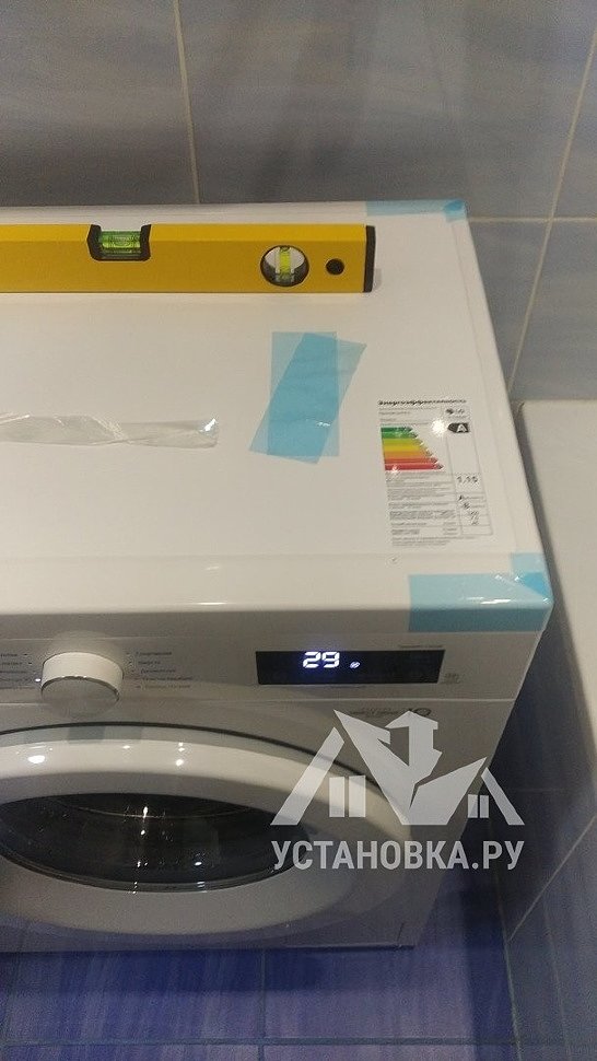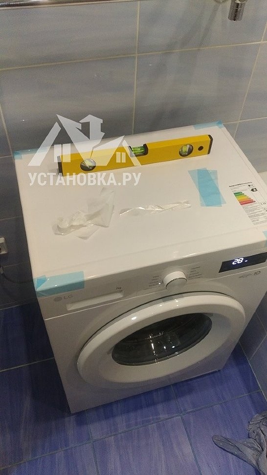 - Снятие транспортировочных креплений у стиральной машины, выравнивание по уровню.