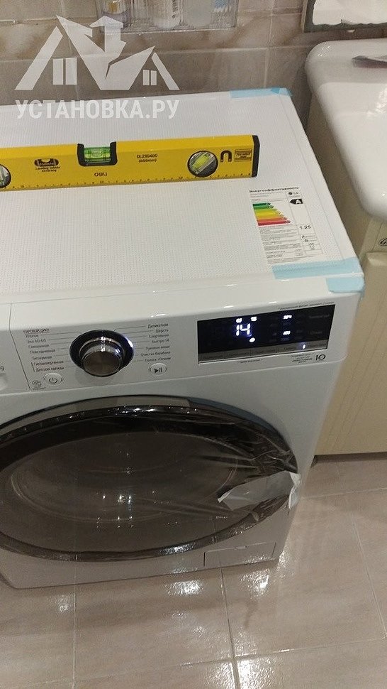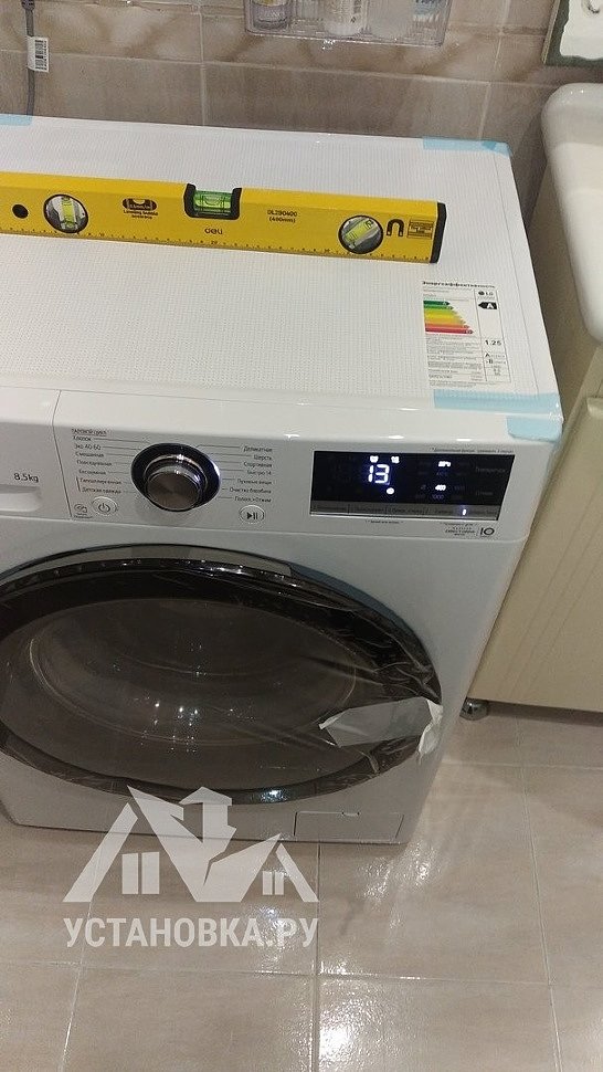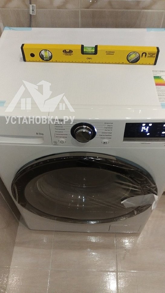 - Снятие транспортировочных креплений у стиральной машины, выравнивание по уровню.