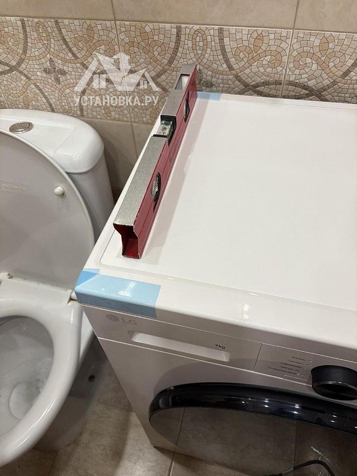 - Снятие транспортировочных креплений у стиральной машины, выравнивание по уровню.