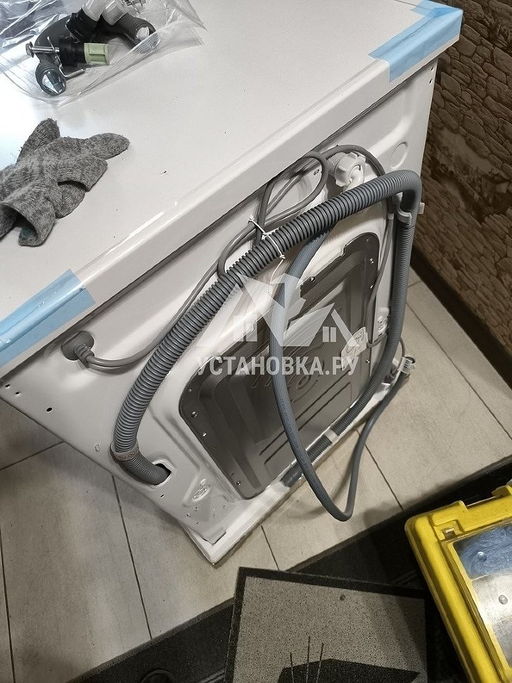 - Снятие транспортировочных креплений у стиральной машины, выравнивание по уровню.