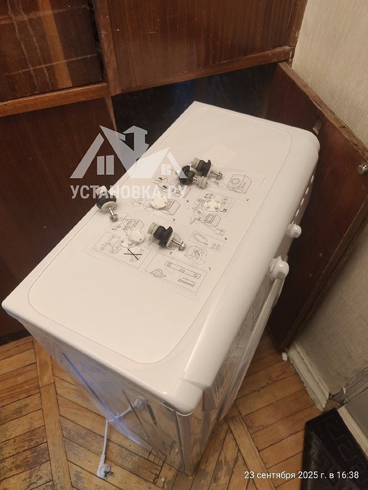 - Снятие транспортировочных креплений у стиральной машины, выравнивание по уровню.