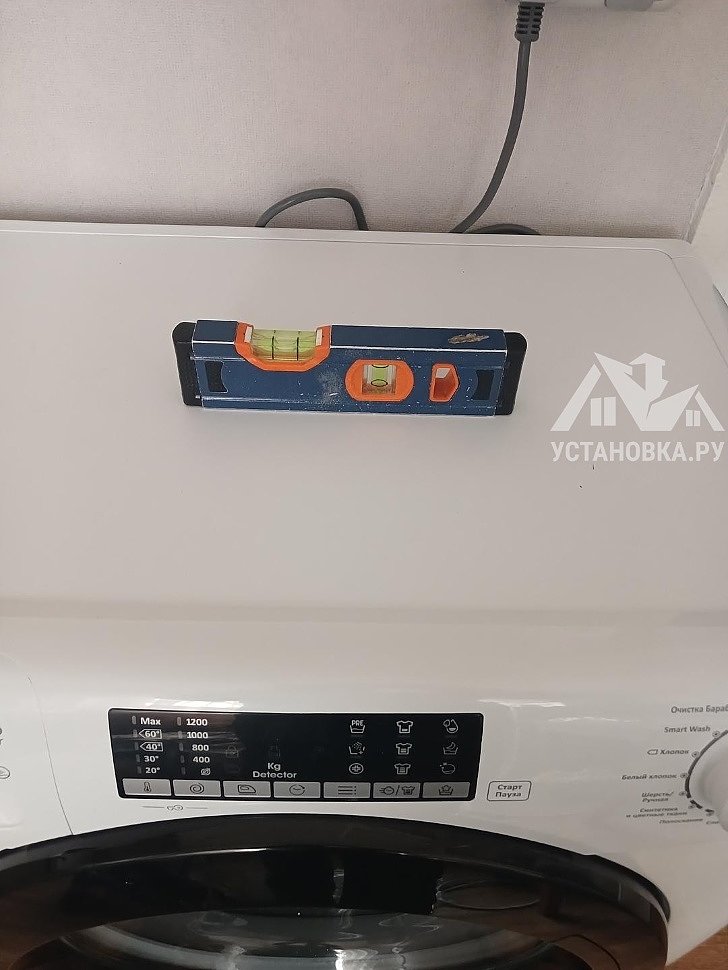 - Снятие транспортировочных креплений у стиральной машины, выравнивание по уровню.