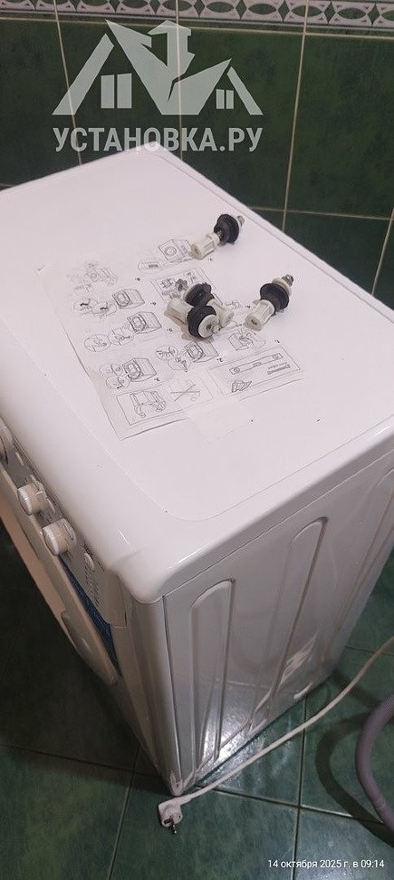 - Снятие транспортировочных креплений у стиральной машины, выравнивание по уровню.