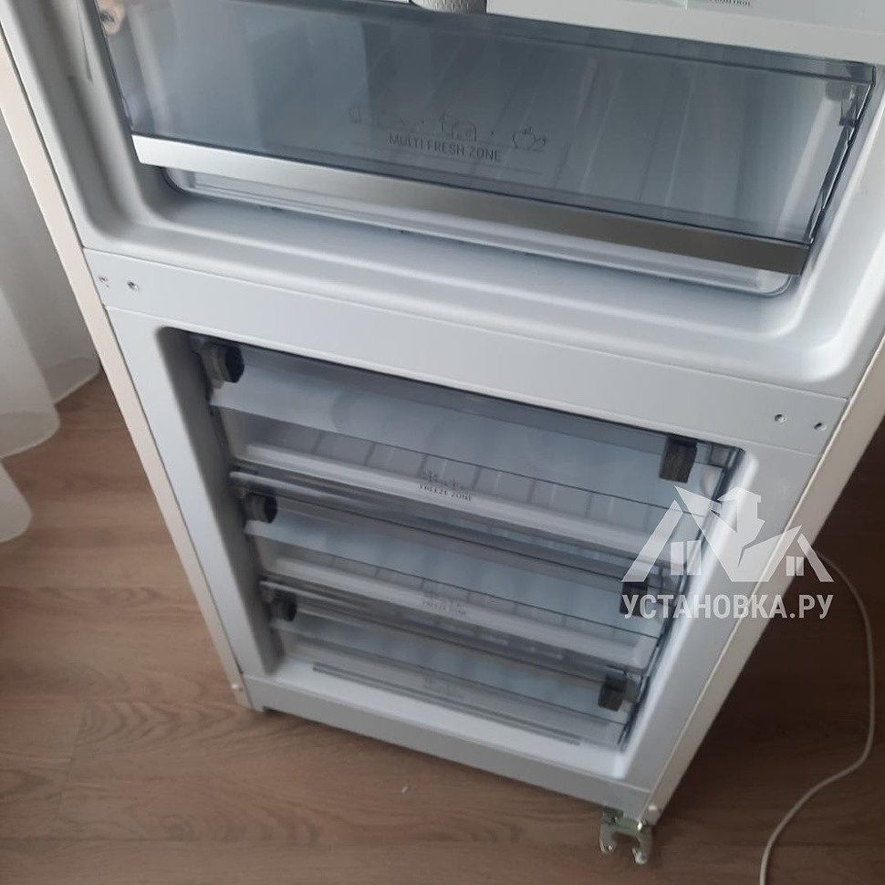 - Демонтаж либо установка нижней полки под холодильник. Для выставления холодильника по высоте.
