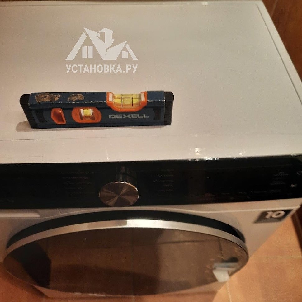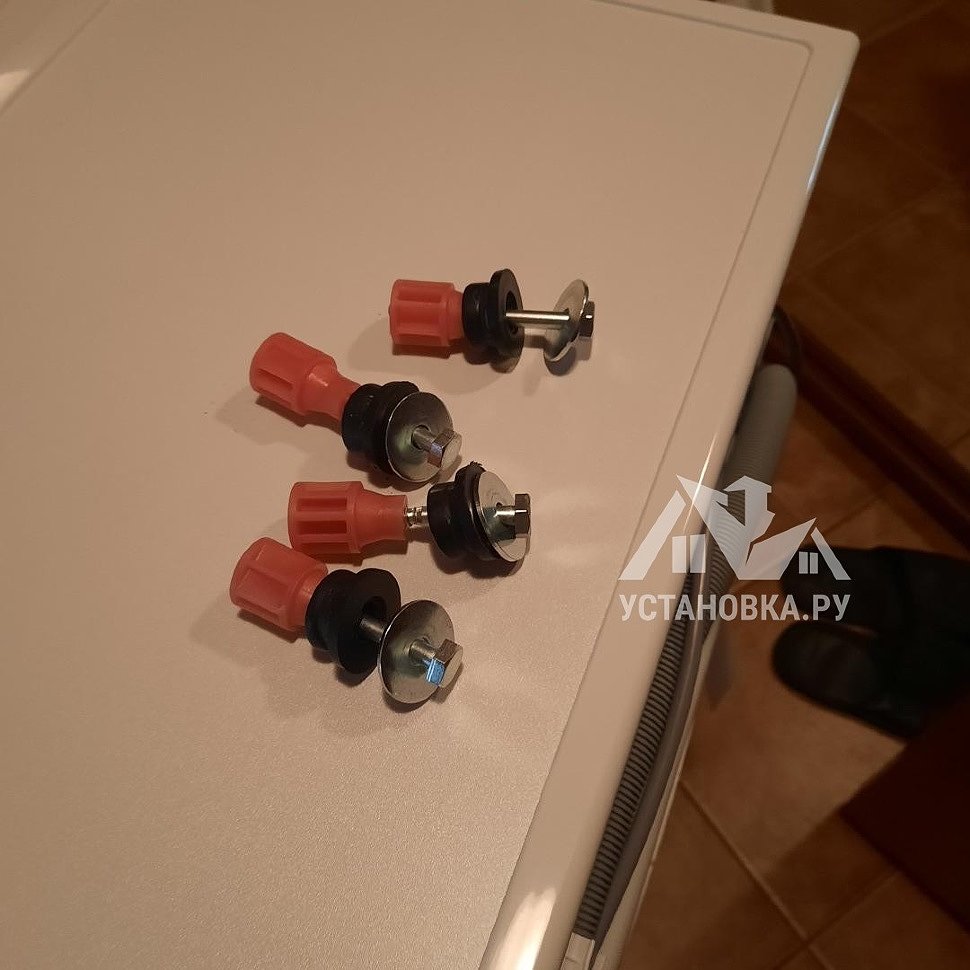 - Снятие транспортировочных креплений у стиральной машины, выравнивание по уровню.