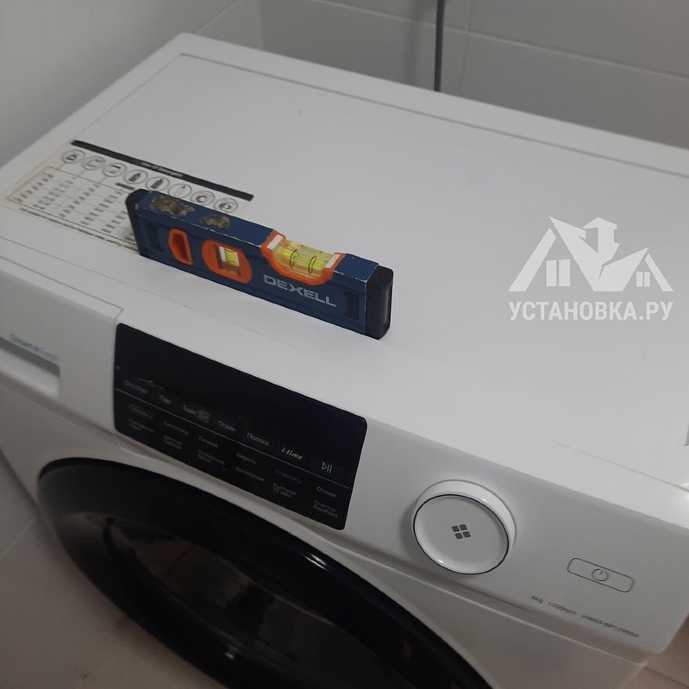 - Снятие транспортировочных креплений у стиральной машины, выравнивание по уровню.