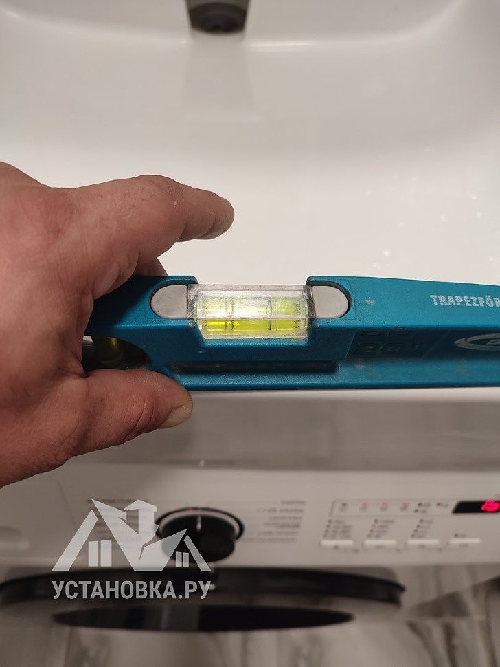 - Снятие транспортировочных креплений у стиральной машины, выравнивание по уровню.