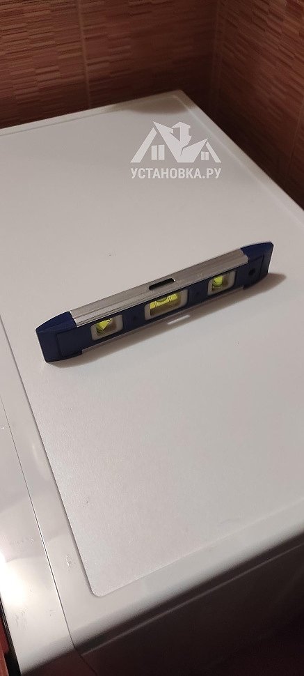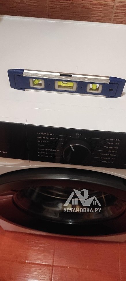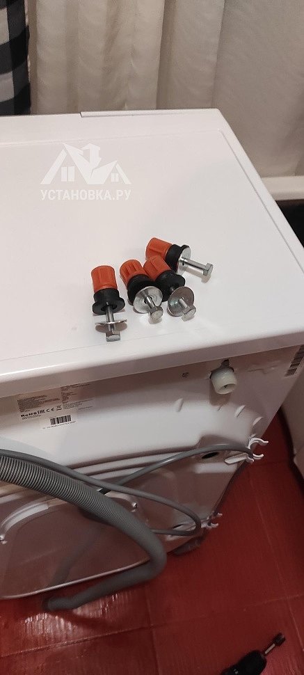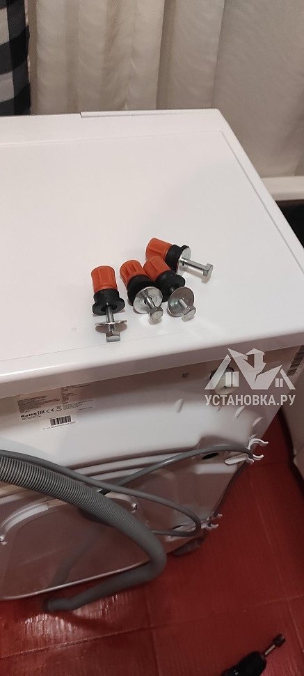 - Снятие транспортировочных креплений у стиральной машины, выравнивание по уровню.