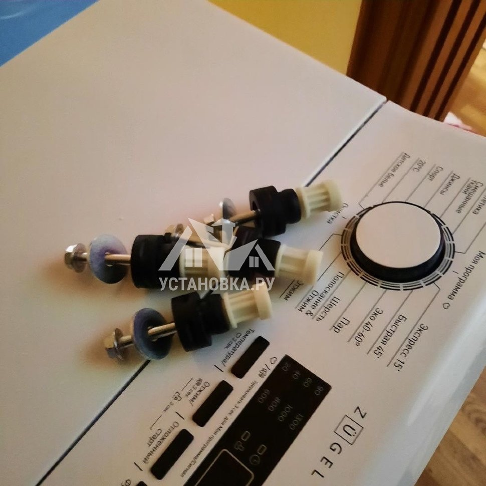 - Снятие транспортировочных креплений у стиральной машины, выравнивание по уровню.