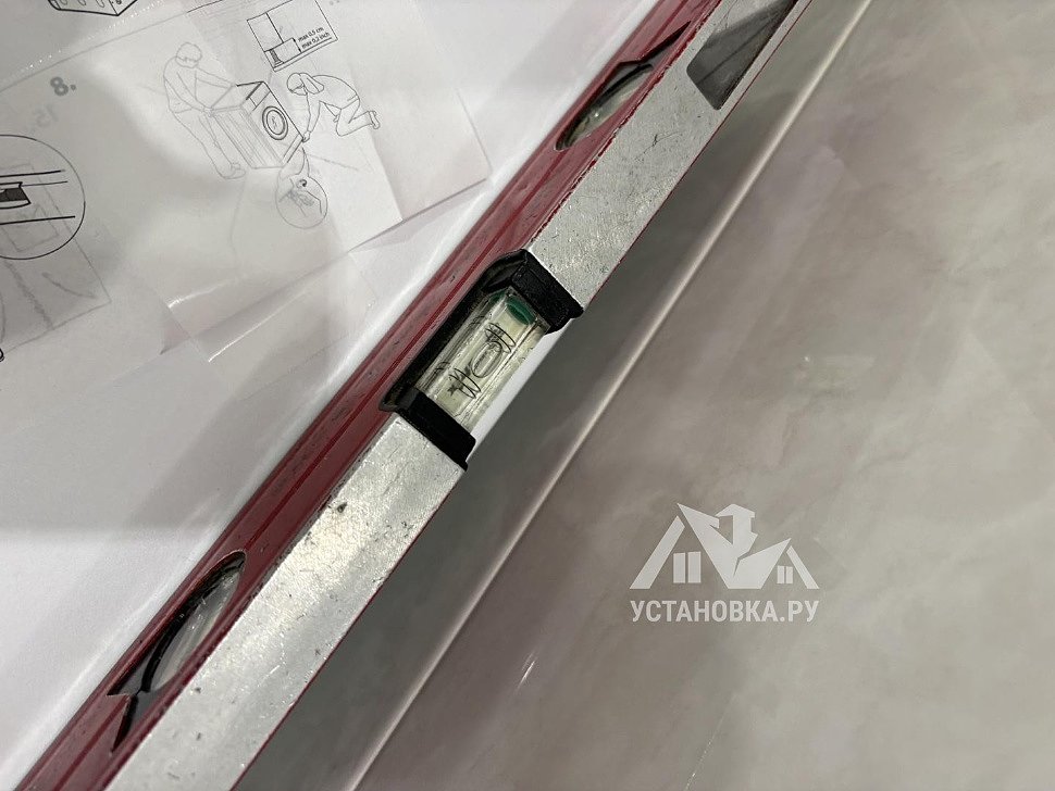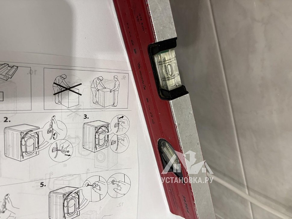 - Снятие транспортировочных креплений у стиральной машины, выравнивание по уровню.