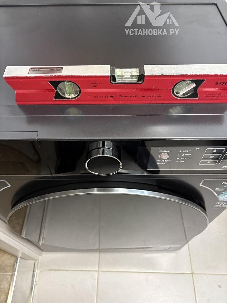 - Снятие транспортировочных креплений у стиральной машины, выравнивание по уровню.