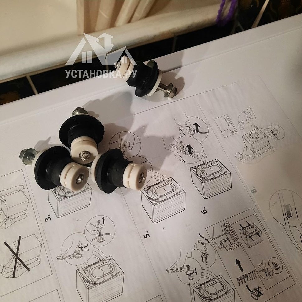 - Снятие транспортировочных креплений у стиральной машины, выравнивание по уровню.