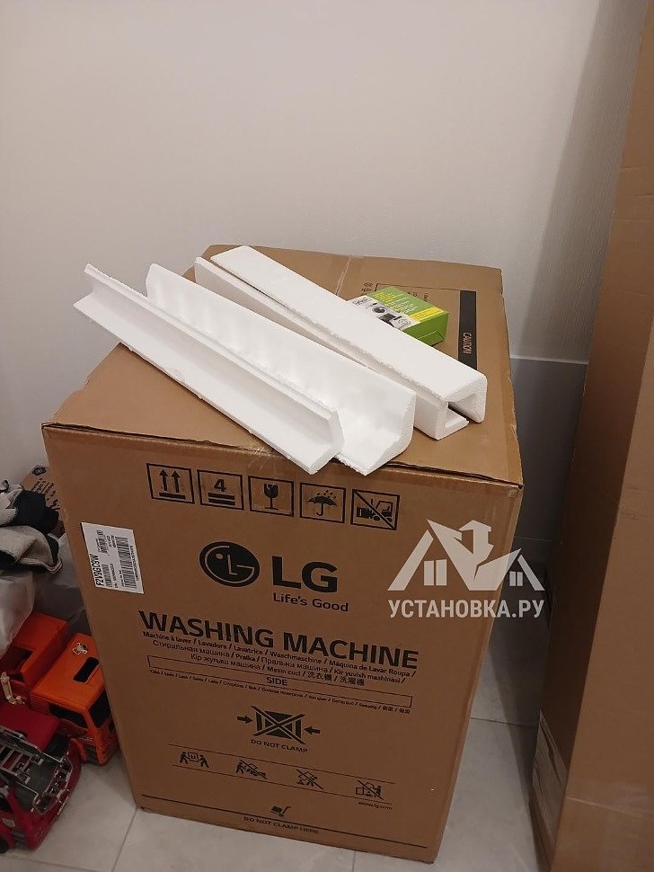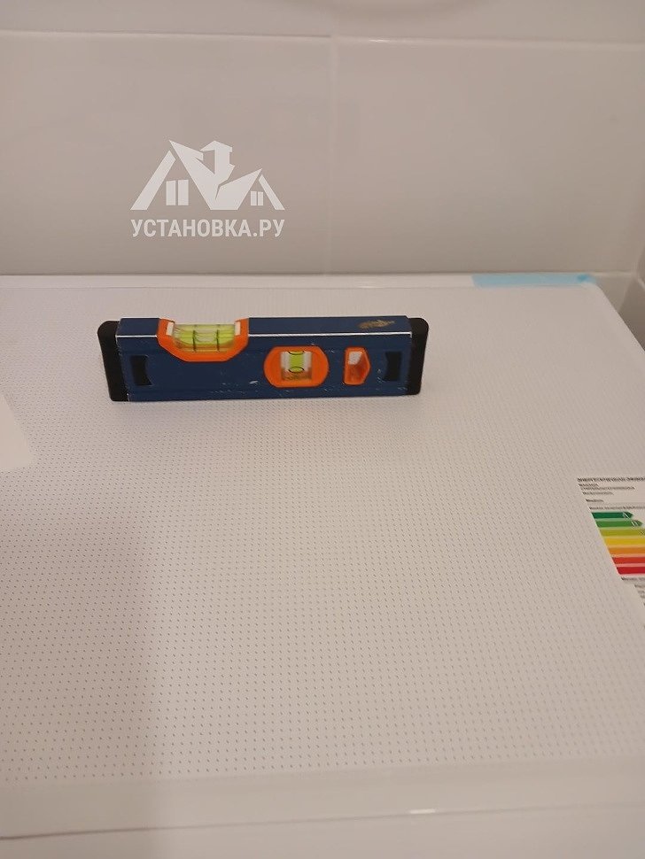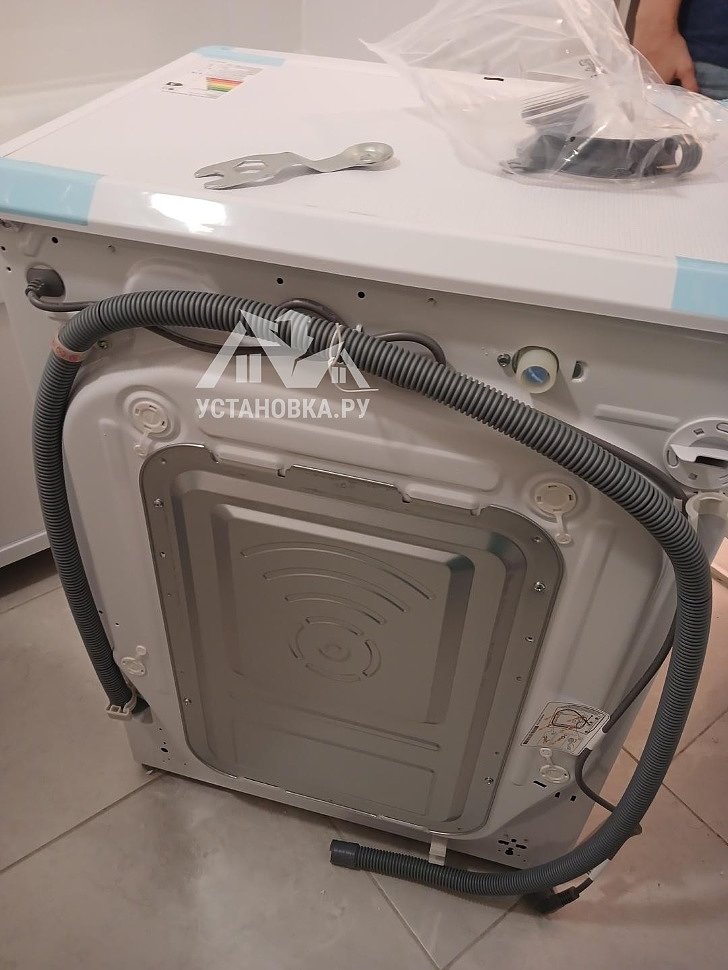 - Снятие транспортировочных креплений у стиральной машины, выравнивание по уровню.