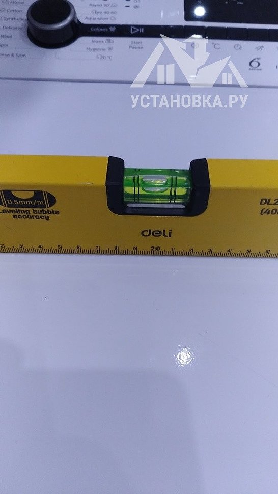 - Снятие транспортировочных креплений у стиральной машины, выравнивание по уровню.