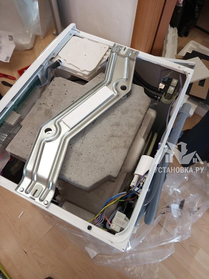 - Снятие транспортировочных креплений у стиральной машины, выравнивание по уровню.