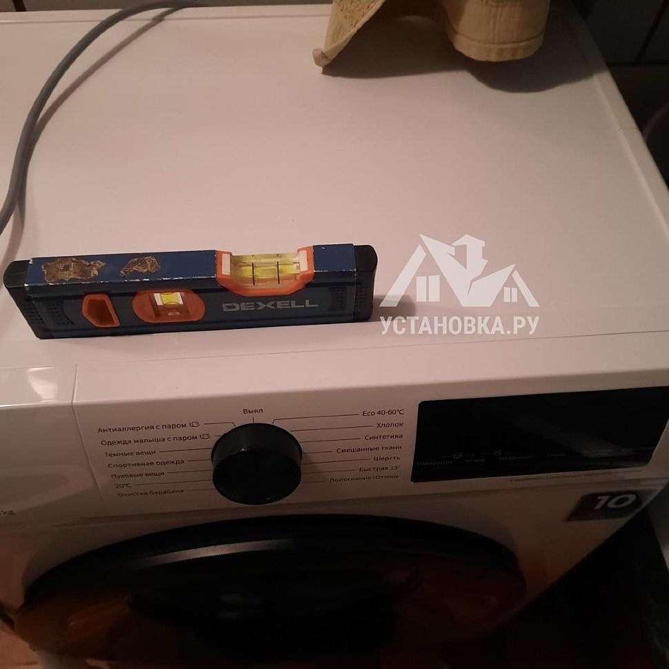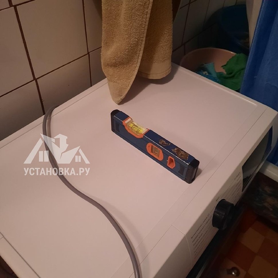 - Снятие транспортировочных креплений у стиральной машины, выравнивание по уровню.