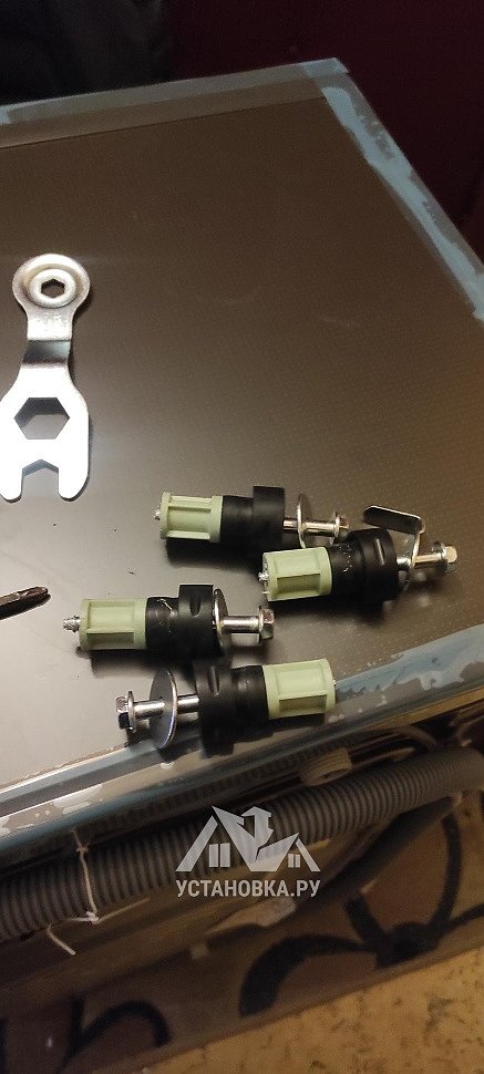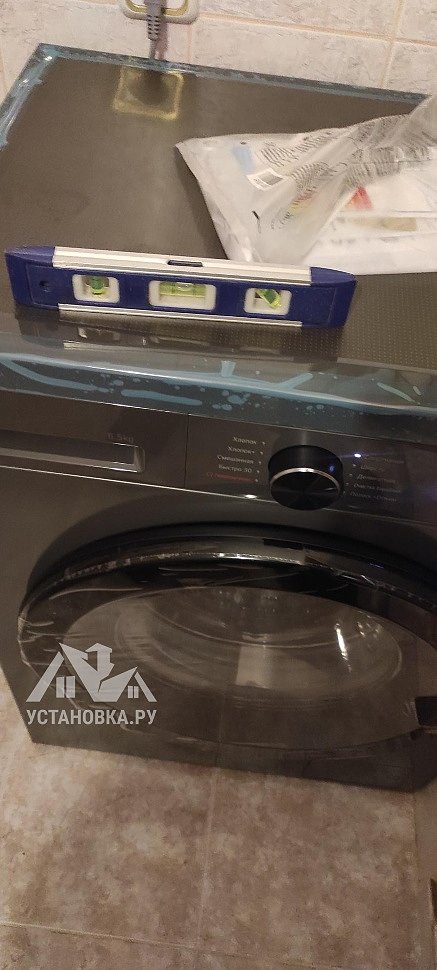 - Снятие транспортировочных креплений у стиральной машины, выравнивание по уровню.