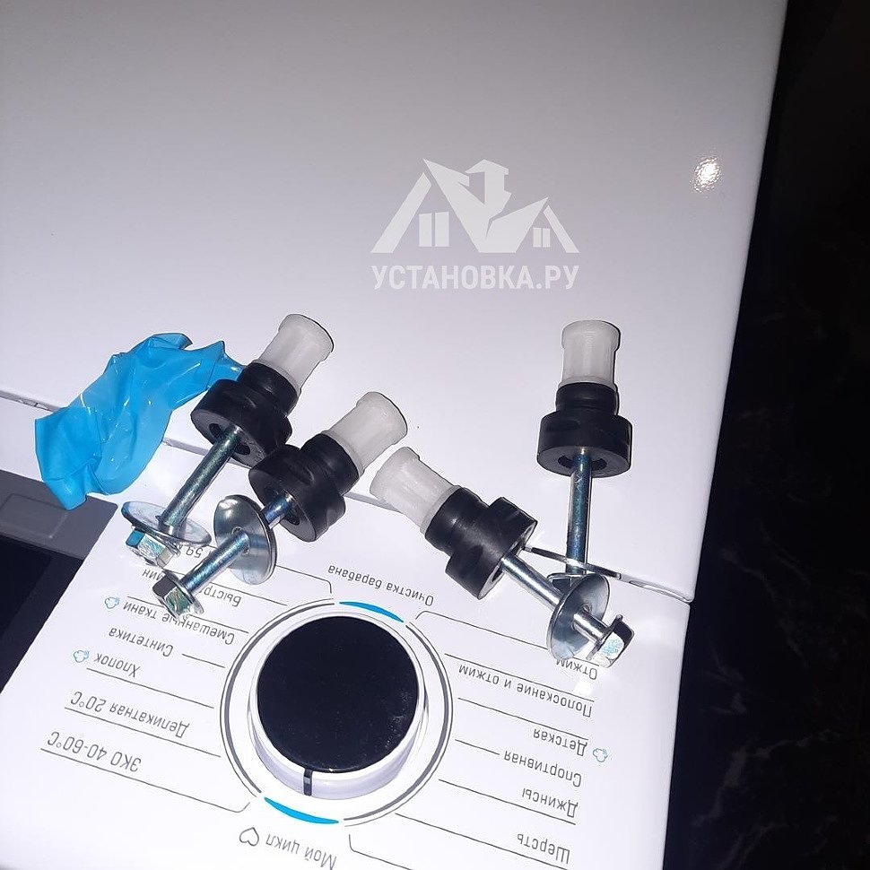 - Снятие транспортировочных креплений у стиральной машины, выравнивание по уровню.