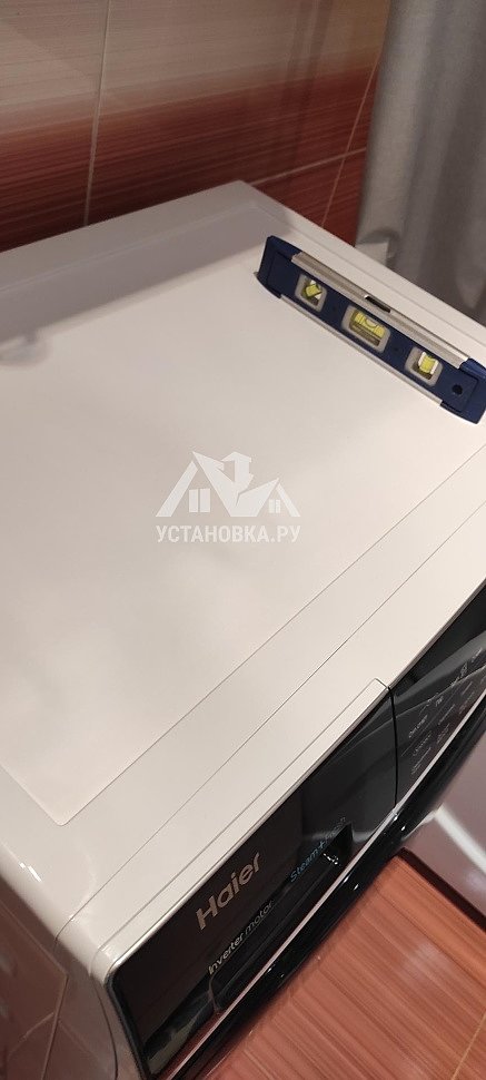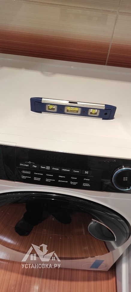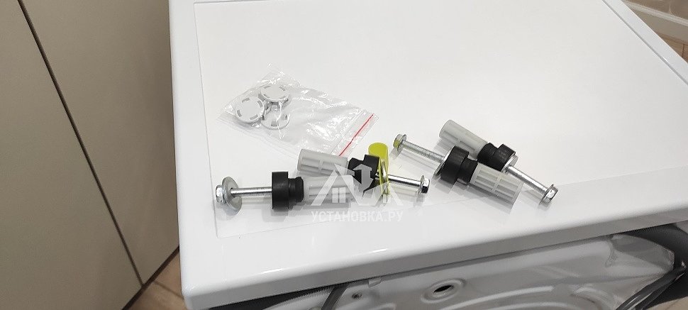 - Снятие транспортировочных креплений у стиральной машины, выравнивание по уровню.