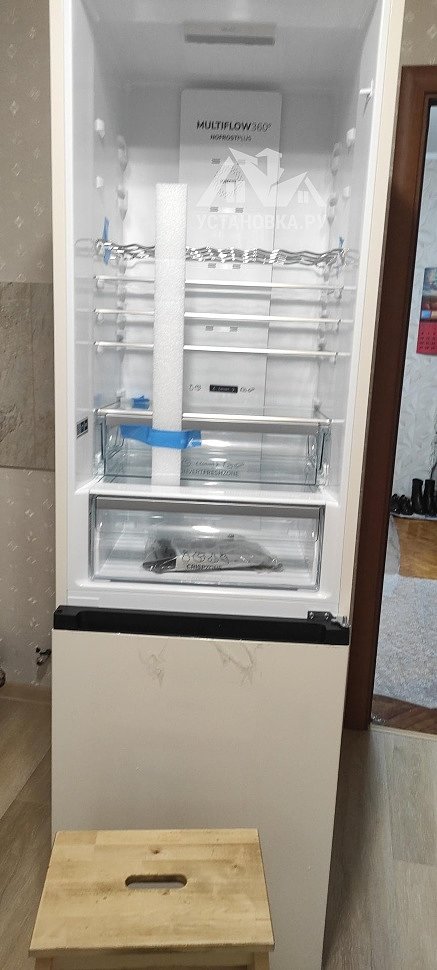 - Демонтаж либо установка нижней полки под холодильник. Для выставления холодильника по высоте.
